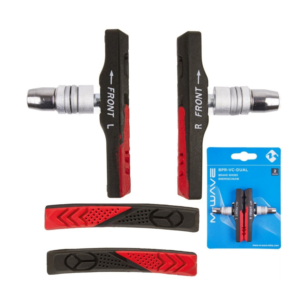 značka M-Wave Nemecko, guma, dve farby - čiena : extra účinné brzdenie, červená : vysoká odpudivosť vody, kolík oceľ, farba guma čierna, kolík strieborný, dĺžka gumičky 72 mm, asymetrický tvar, čo znamená, že pravá a ľavá strana sú rozdielne, kolík so závitom, podložkami a maticou na imbusový kľúč, 1 pár