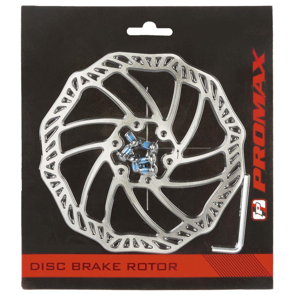 značka Promax 160mm, ku kotúčovým brzdám, 6 otvorov, priemer 160 mm, kotúč dodávaný vrátane 6 ks skrutiek, vyrobené z nehrdzavejúcej ocele, balené v blistri Promax, hmotnosť len 96 g