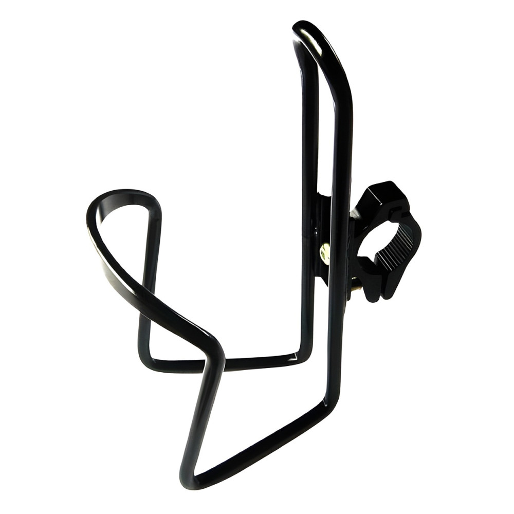 košík na fľašu duralový s držiakom na riaditka na priemer 25,4 mm s možnosťou demontáže držiaka a použitia na rám bicykla, skrutka na imbus číslo 5, čierny, balený v PVC sáčku