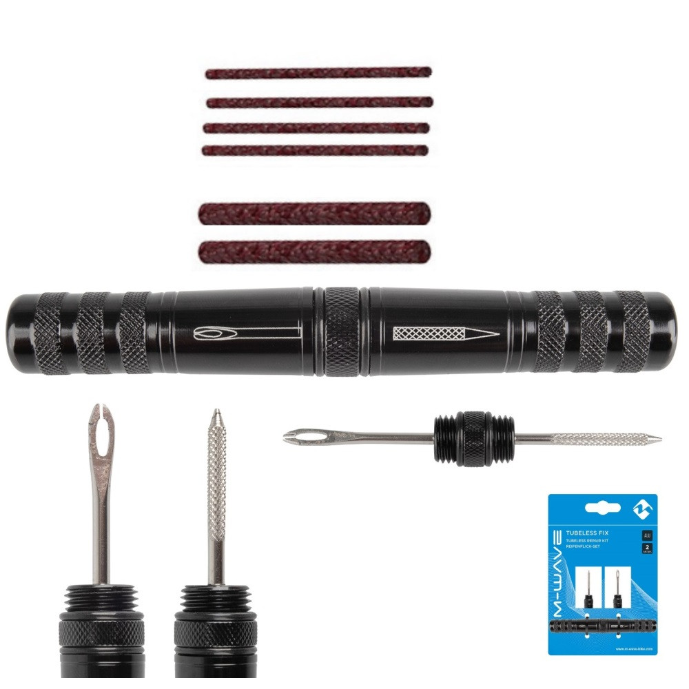 značka M-Wave Nemecko, Opravné knoty pre bezdušové cyklo pneumatiky. Obsah balenia : 5 ks opravné knoty priemer 1,5 mm a 3 ks opravné knoty priemer 3,5 mm, 1 ks prieťažník knotu na uzávere obalu, rašpla na začistenie dier, 1 ks vodeodolný duralový obal, rozmer 14x107 mm. Oprava trvá len niekoľko sekúnd – v momente ste späť na ceste! Hmotnosť 24,5 g
