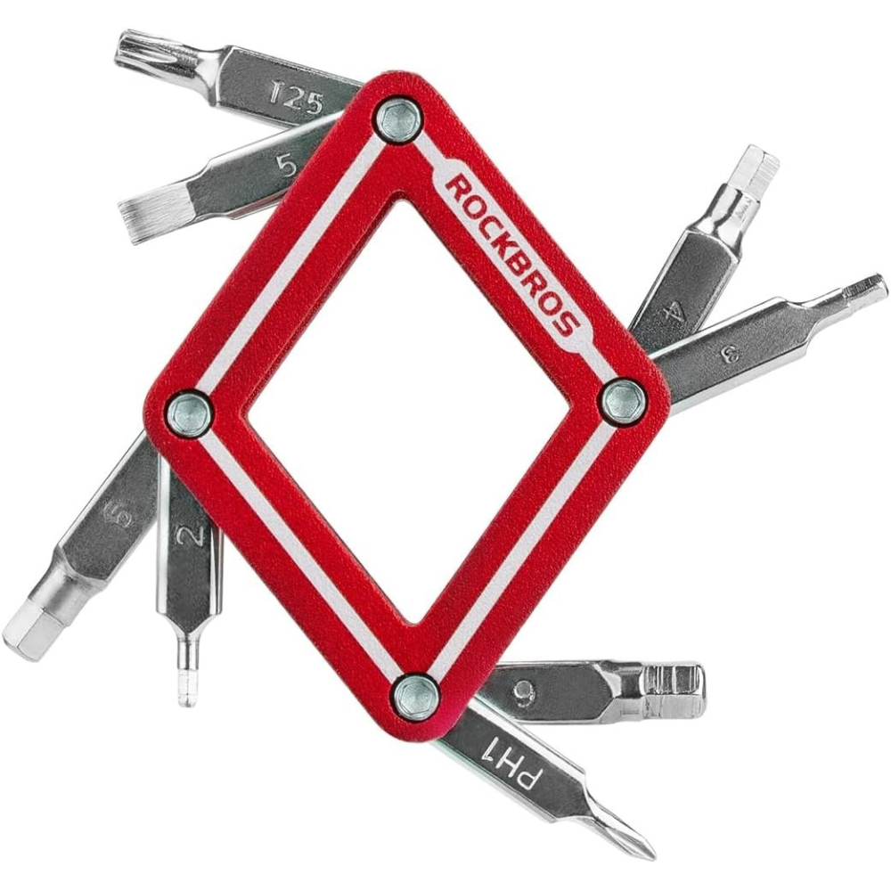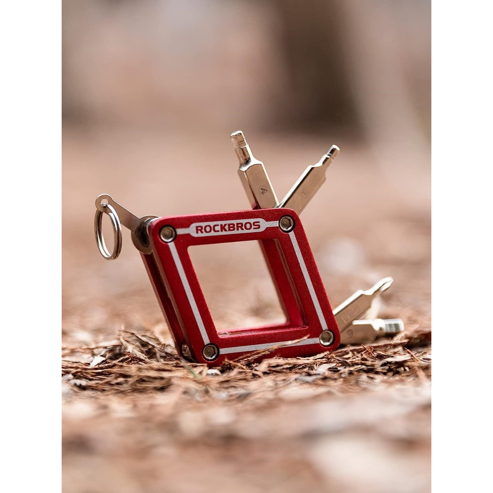 značka Rockbros, súprava náradia na opravu bicyklov 8 v 1, je vyrobená z legovanej konštrukčnej ocele, ktorá je trvácna a odolná voči korózii, pri používaní je schopná vydržať veľkú silu otáčania. Obsahuje imbusový kľúč (2 mm, 3 mm, 4 mm, 5 mm, 6 mm), Torx-2,5 mm, plochý skrutkovač, krížový skrutkovač.Hmotnosť 96g, rozmery 4,8 x 2 x 5 cm (D/Š/V), dostatočne mini na to, aby sa dala vložiť do sedlových tašiek alebo vrecka s karikou na kľúče.