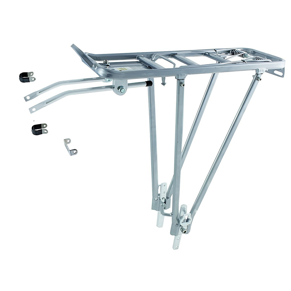 Nosič zadný, úchyt do bočných návarkov rámu bicykla ( pri chýbajúcich návarkoch použijete priložené objímky ), alebo do stredu mostíka rámu bicykla pomocou redukčnej sady, vyrobený z duralových trubiek, s 2 vzperami, nastaviteľný sklon nosiča presunutím tiahla v montážnom otvore, s návarkami na hustilku, s držiakom na montáž odrazky, s pružinou na uchytenie batožiny, vhodný na rozmer kolies 24 -29 palcov, material dural, farba strieborná, nosnosť do 25kg.