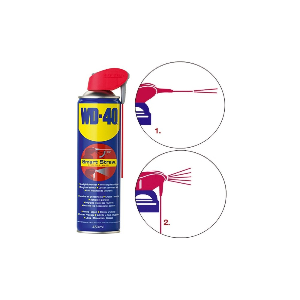 značka WD-40, nové prevedenie WD-40 SMART STRAW predstavuje jedinečný a revolučný spôsob nanášania prípravku pomocou duálnej trysky so zafixovanou aplikačnou slamkou. Táto inovácia umožnuje jednoduché nanášanie prípravku zvyčajným spôsobom a zabraňuje strate slamky. Pre presnú, bodovú aplikáciu WD-40 nastavte slamku kolmo na plechovku, pokým nezapadne do určenej polohy a použite obvyklím spôsobom. Ak potrebujete WD-40 naniesť na širšiu plochu, jednoducho slamku nechajte vo zvislej polohe. Oba spôsoby nanášania sú bežné pre WD-40 , so systémom SMART STRAW však pohodlnejšie a jednoduchšie.