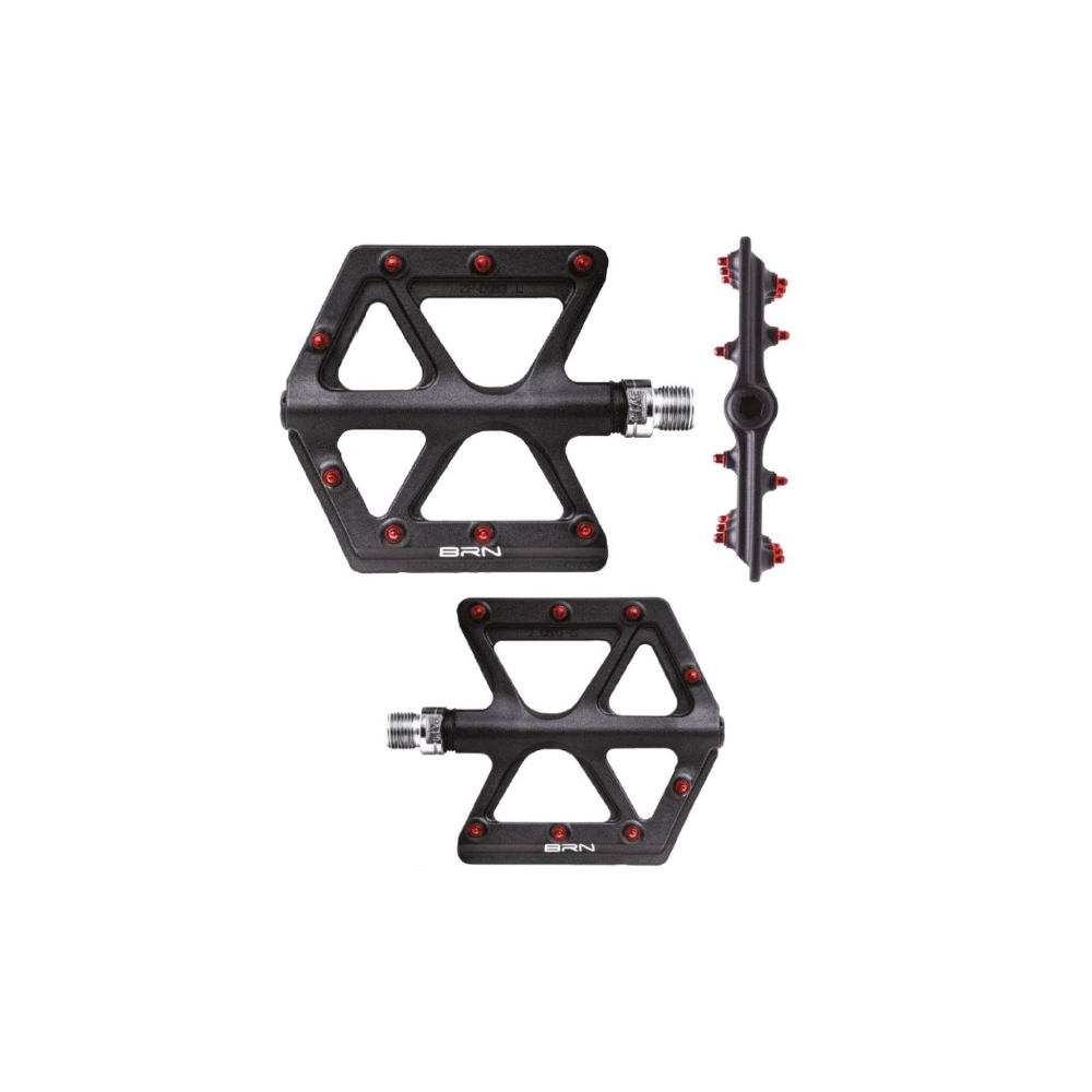 značka BRN, materiál : karbónový kompozit, ložiskový pedál, oska Cr-Mo, 16 protišmykových červených vymeniteľných pinov, rozmer 95x100x15 mm, hmotnosť 228 g