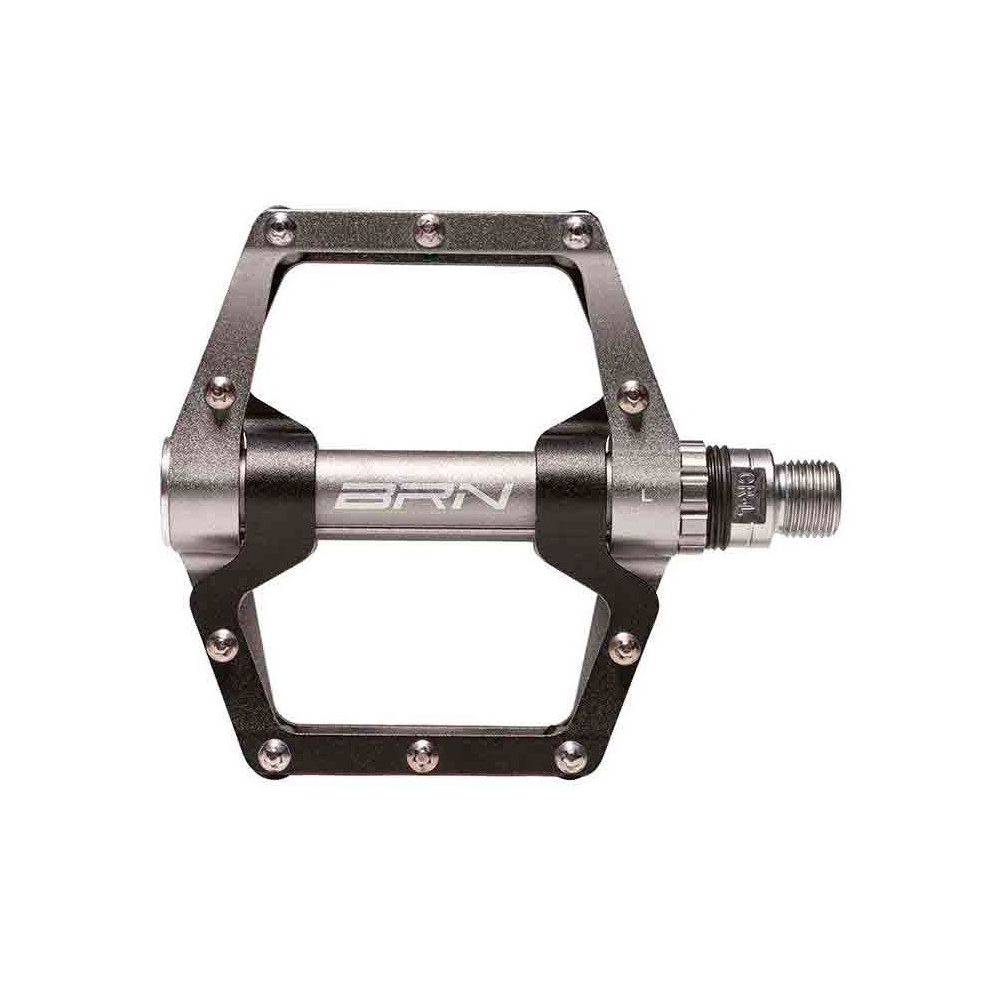 značka BRN, materiál : CNC dural, anodizovaný titanovo čierny, ložiskový pedál s 3 priemyselnými ložiskami, oska Cr-Mo, jedna strana pedálu je osadená 10 protišmykovými striebornými vymeniteľnými pinmi, rozmer 90x100 mm, hmotnosť 380 g/pár.Balené v krabičke BRN.