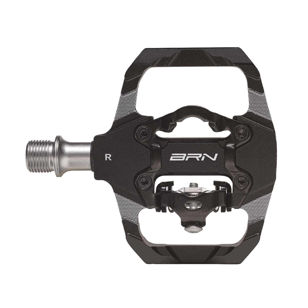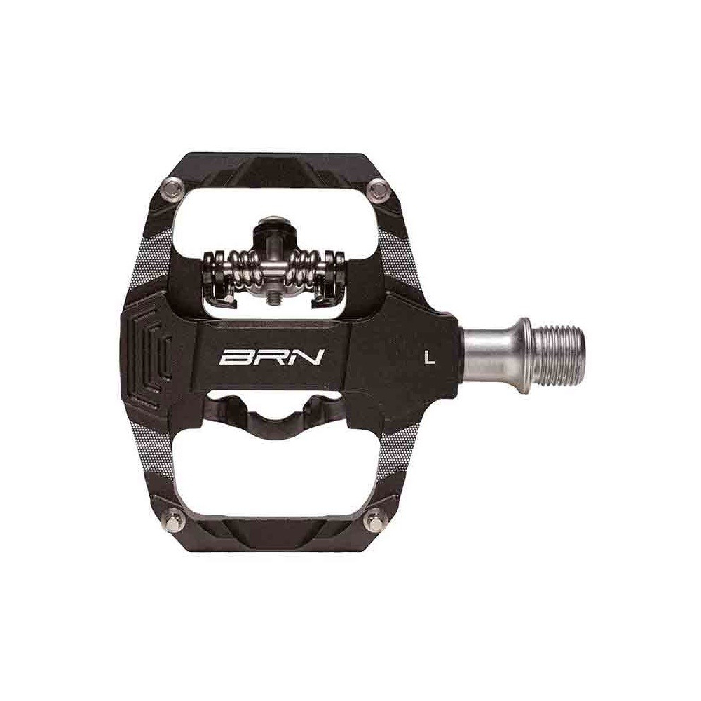 značka BRN, materiál : CNC dural, ložiskový pedal s 3 priemyselnými ložiskami, oska Cr-Mo, jedna strana pedálu je osadená 8 protišmykovými striebornými vymeniteľnými pinmi, pre nášlapnú obuv vrátane zarážok, kompatibilné so Shimano SPD systémom, rozmer 77x92 mm, hmotnosť 378 g/pár.Balené v krabičke BRN.