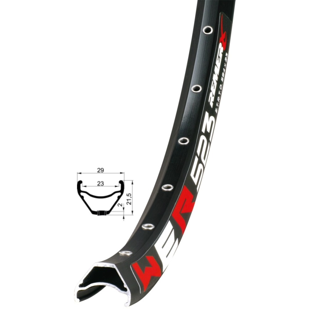 značka Remerx. Nový typ ráfika pre kolesá kategórií trail a enduro umožňujúce bezproblémové použitie širokých plášťov. Vnútorné profil ráfika so šírkou 23 milimetrov poskytuje toľko tuhosti, pevnosti a stability, koľko je pre agresívnu jazdu náročným terénom treba. Ráfik vhodný pre MTB elektrobicykle., farba čierna elox, materiál dural, dvojstenný viackomorový stredne vysoký 23mm profil, 1 x nitovaný otvor, vhodný len pre kotúčové brzdy, rozmer 622x23, priemer kolesa 28,29 palcov, 32 dier , hmotnosť ráfika 587 g