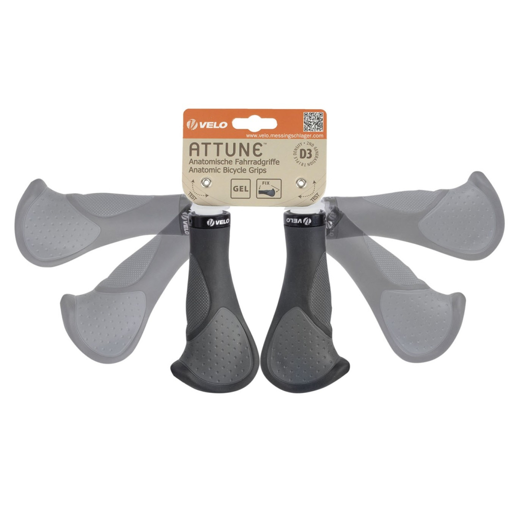 značka Velo D3 Ergogel, materiál špeciálna trojzložková zmes, prvá tvrdý plast vo vnútri pre dobré spojenie s riadidlom, dve rozdielne vonkajšie gelové mäkké zmesi pre komfort a tlmenie nárazov, dľžka 140 mm, jednoduché uchytenie na riadidlo pomocou imbusovej skrutiky na objímke, balené na Velo karte
