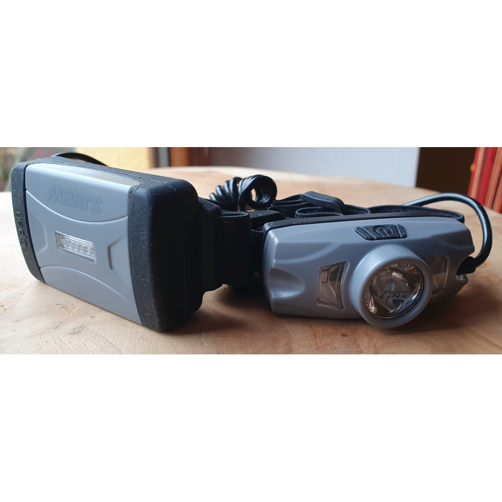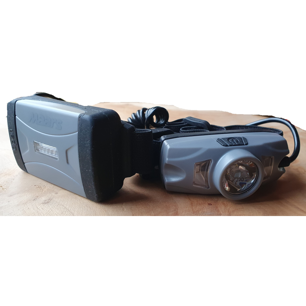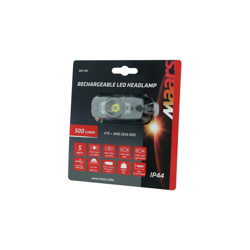 výrobca Maars, svetlo predné čelovka Maars, 5Watt Cree XTE LED 500 Lm. + 2x SMD červená LED, 4 funkcie : 100% svieti hlavná stredná LED, 50% svieti hlavná stredná LED, svietia 2 x bočné červené diódy, blikajú 2 x bočné červené diódy. Pri zapnutých predných LED bliká červený LED pásik umiestnený na batériovom púzdre. USB nabíjateľná Li-on batéria, doba svietenia až 4,5 hod., vodeodolnosť : IP44., hmotnosť 75 gramov, LED Cree je americký výrobca a ich diódy patria medzi najvýkonnejšie svetelné zdroje.
