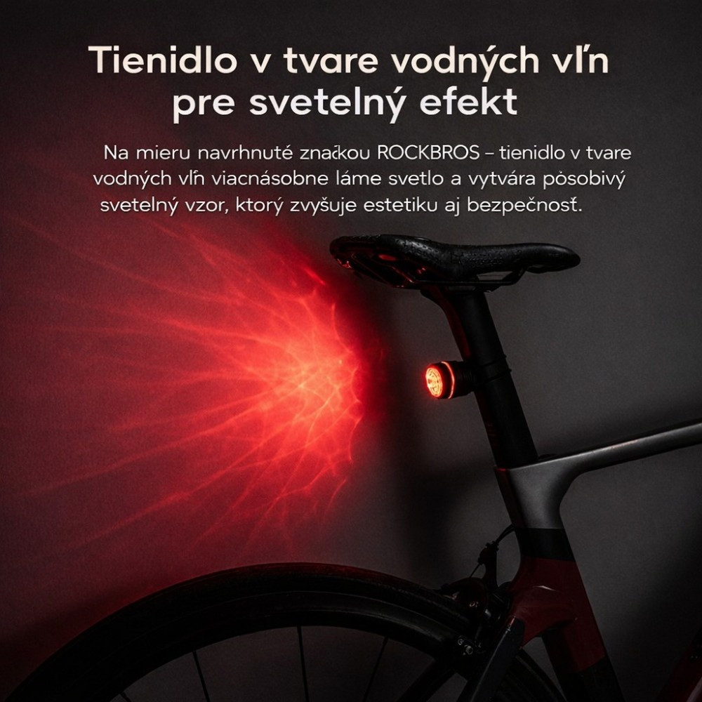 Svetlo zadné RB, 6 Funkcií, IPX6, COB LED, USB nabíjateľné, vodeodolné. V cene výrobku je zahrnutý recykl.pop.pre SR v sume 0,12