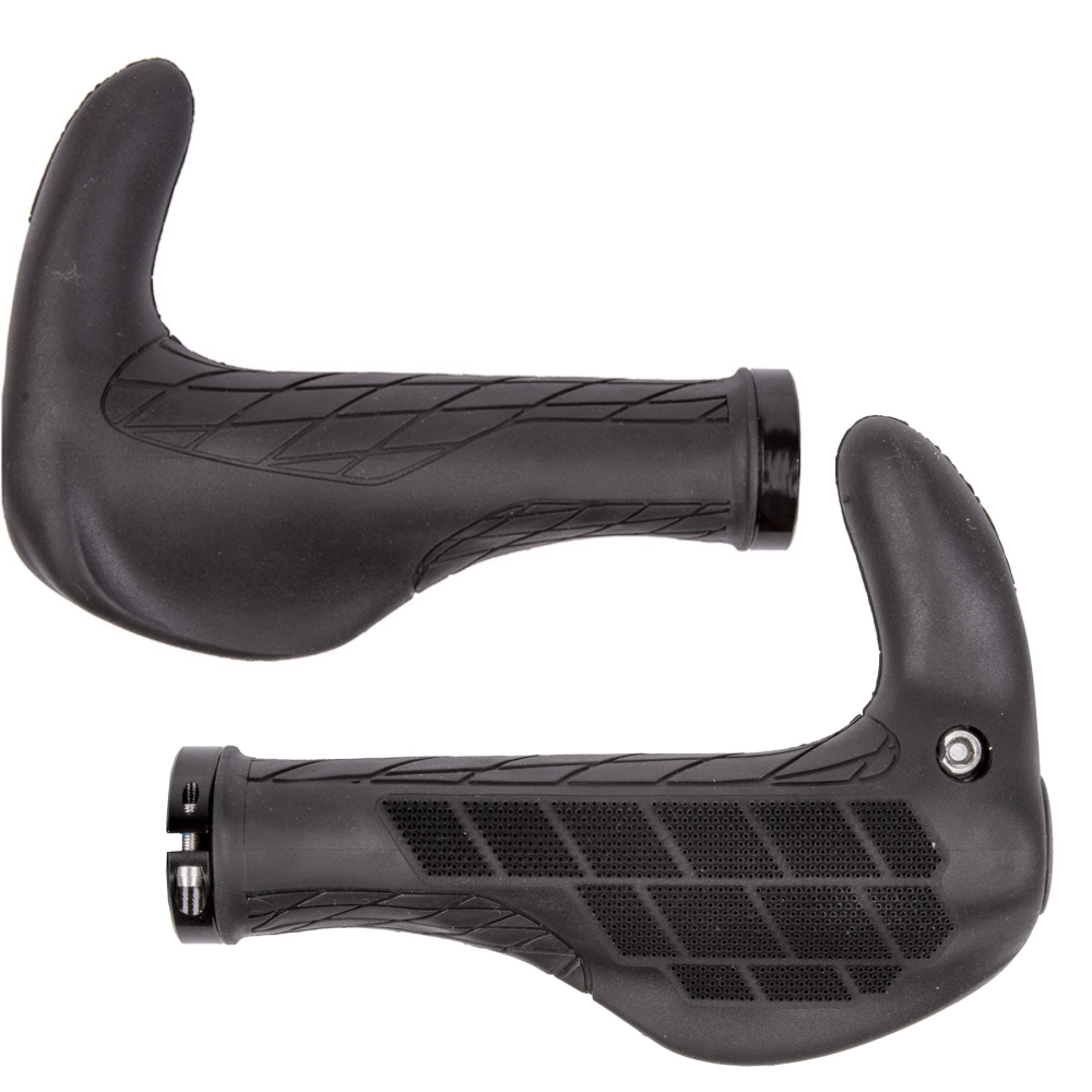 značka M-Wave Nemecko, materiál špeciálna dvojzložková zmes, prvá tvrdý plast vo vnútri pre dobré spojenie s riadidlom, druhá vonkajšia mäkká zmes pre komfort a tlmenie nárazov, na vnútornej strane ukončenie rukoväte duralovou objímkou, na vonkajšej strane ukončenie rukoväte duralovým rohom, farba čierna, celková dĺžka spolu s rohom 140 mm, na karte M-Wave