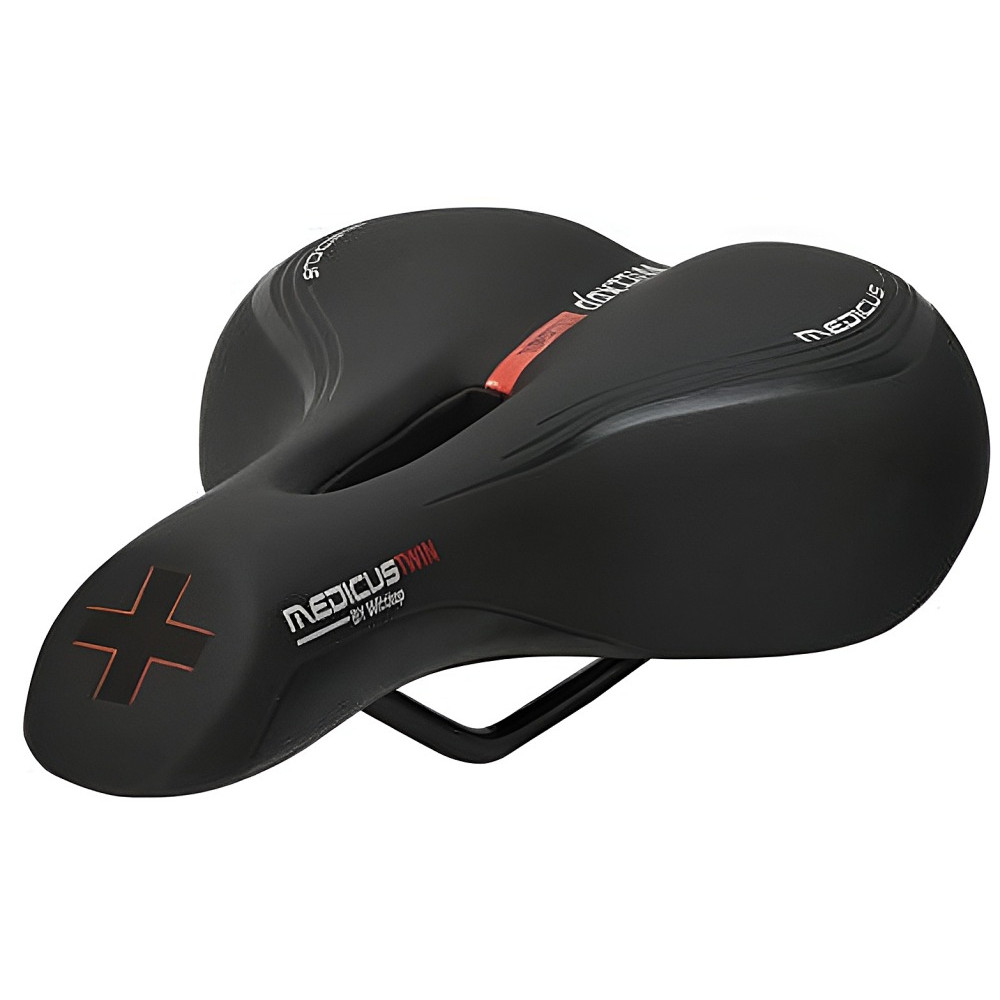 značka WITTKOP, dĺžka 255 mm, šírka 185 mm, Toto sedlo bolo vyvinuté nemeckým ortopédom Dr. Torstenom Werlom a je postavené na osvedčenom Wittkop-Medicus princípe. Nemecký výrobca Wittkop u svojich sedadiel úspešne kombinuje inovácie a tradície. Tradičná ručná výroba sedadiel zaručuje vysokú kvalitu a nové technológie maximálnu funčnosť. Taliansky vplyv je viditeľný v modernom dizajne sedadiel Wittkop. Sedlo GEL, TWIN Medicus 2.0 dámske s otvorom, bez zámku, navrhnuté špeciálne pre trekingové a dámske bicykle, s anatomickými dutinami (full hole), anatomická forma v dizajne : 5 - Step