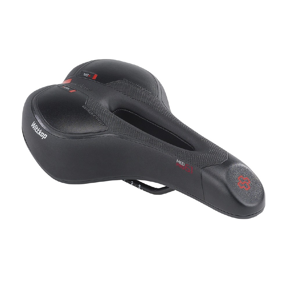 značka WITTKOP, dĺžka 280 mm, šírka 170 mm, Toto sedlo bolo vyvinuté nemeckým ortopédom Dr. Torstenom Werlom a je postavené na osvedčenom Wittkop-Medicus princípe. Nemecký výrobca Wittkop u svojich sedadiel úspešne kombinuje inovácie a tradície. Tradičná ručná výroba sedadiel zaručuje vysokú kvalitu a nové technológie maximálnu funčnosť. Taliansky vplyv je viditeľný v modernom dizajne sedadiel Wittkop. Sedlo GEL, TWIN Medicus 1.0 pánske s otvorom, bez zámku, navrhnuté špeciálne pre športové trekingové bicykle, s anatomickými dutinami (full hole), anatomická forma v dizajne : 5 - Step