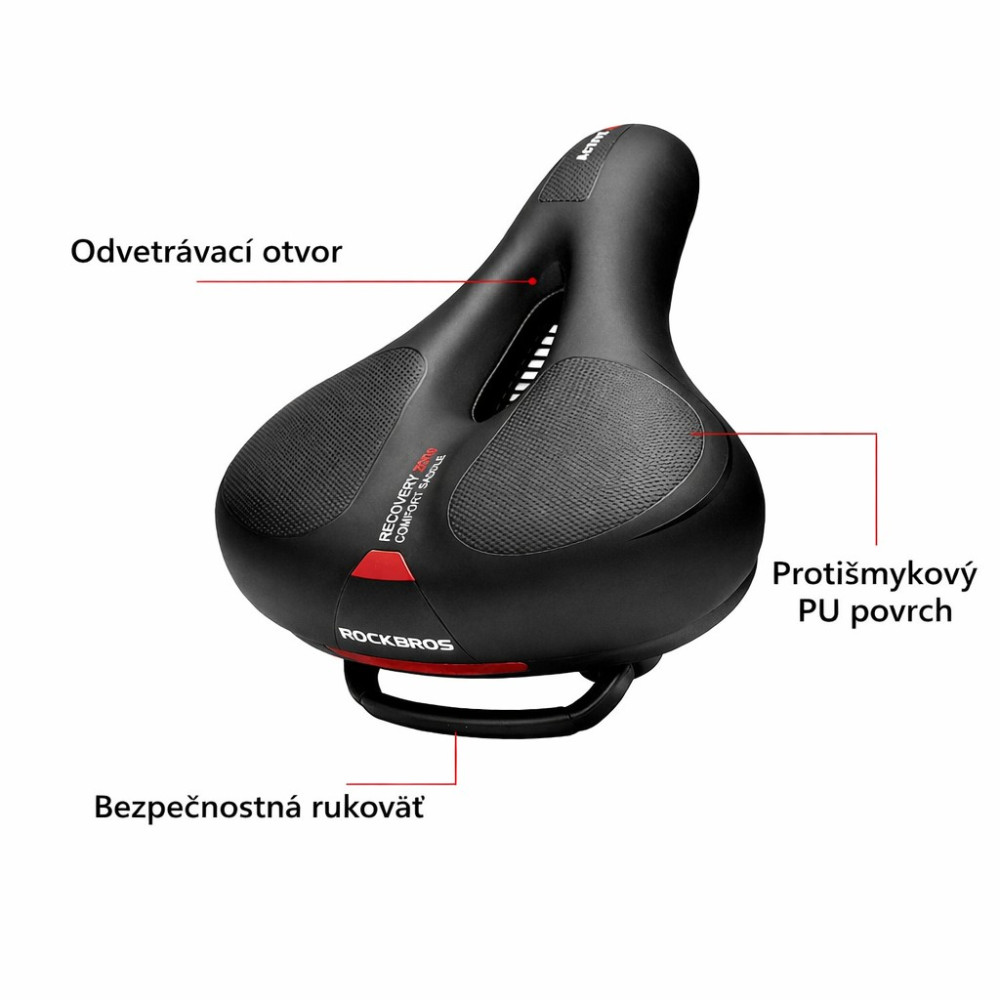 značka Rockbros –Gélové ergonomické sedlo s pamäťovou penou na bicykel tlmiace nárazy, pre mužov / ženy. Dvojitý systém tlmenia nárazov na zadnej strane sedla poskytuje silnú priľnavosť . Sedlo má úzku prednú časť, ktorá umožňuje voľný pohyb stehien počas jazdy. Stredný výrez urýchľuje cirkuláciu vzduchu a odvod tepla, aby sa znížila teplota a vlhkosť v oblasti genitálií počas jazdy. Ergonomické, aerodynamické sedlo na bicykel dokáže účinne zmierniť tlak na boky, takže môžete jazdiť dlhšie bez pocitu únavy a znecitlivenia bedier. Sedlo je vybavené dvoma elastomermi, rukoväťou, červenou odrazkou a pamäťovou penou s gélom. 100% vodotesný povrch sedla. Vrátane zámku sedla Rozmer: 260 mm x 215 mm, Váha: 764g