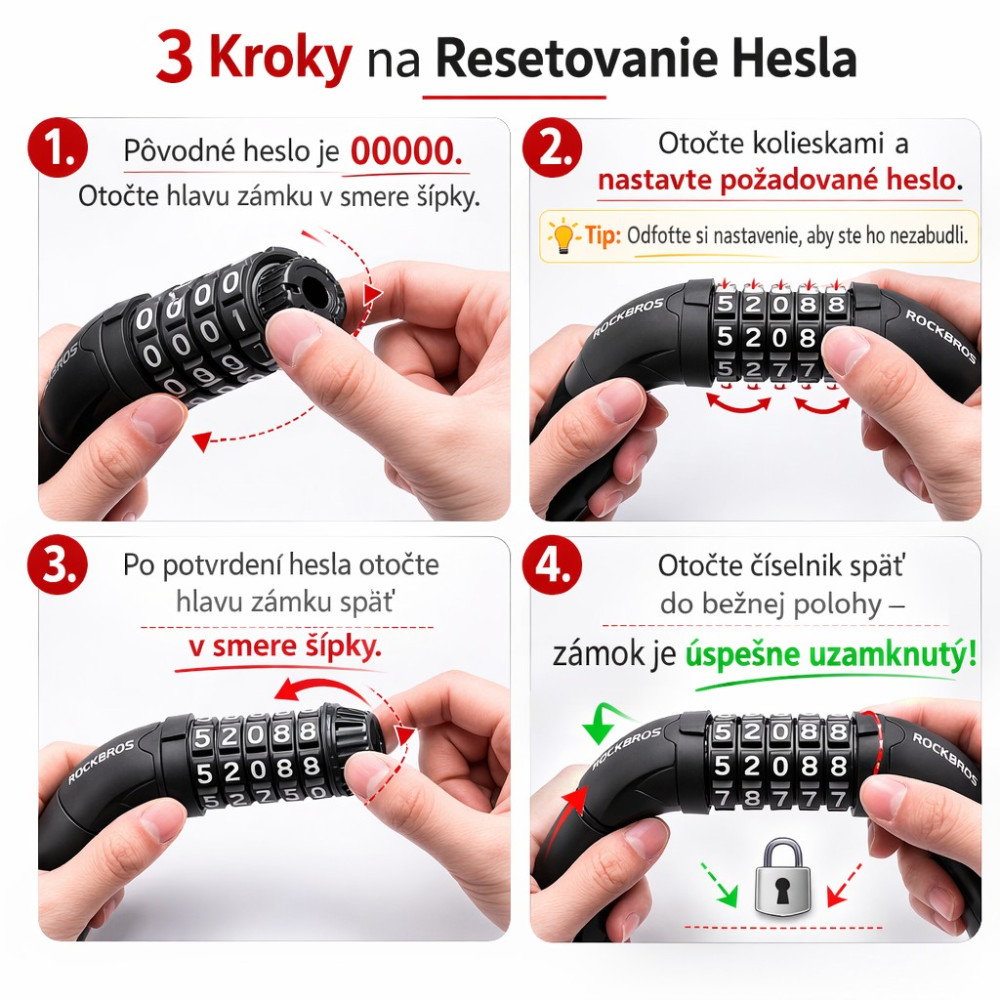 značka Rockbros, vnútro káblového zámku pozostáva zo 6 pevných oceľových prútov odolných voči prerezaniu. PVC na oceľovom lanku ochráni váš bicykel pred poškriabaním.5-ciferná kombinácia hesla, vám umožňuje nastaviť 100 000 možných kombinácií (počiatočné heslo je 00000) a nové heslo môžete nastaviť v troch jednoduchých krokoch. Celková dĺžka zámku je 400 mm, priemer je 15 mm. Je multifunkčný a ideálny na bicykel, motorku, kufor, kočík atď. Zámkový valec je vyrobený z vysoko kvalitného zinku, ktorý je veľmi odolný.Lanko je vyrobené z ocele a poťah z PVC. Hmotnosť 205g.