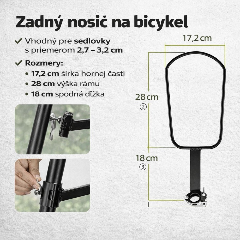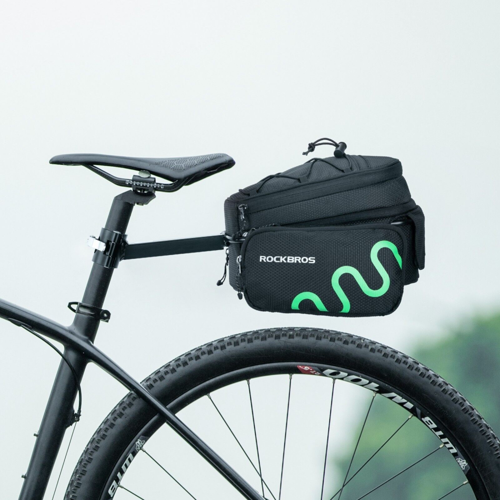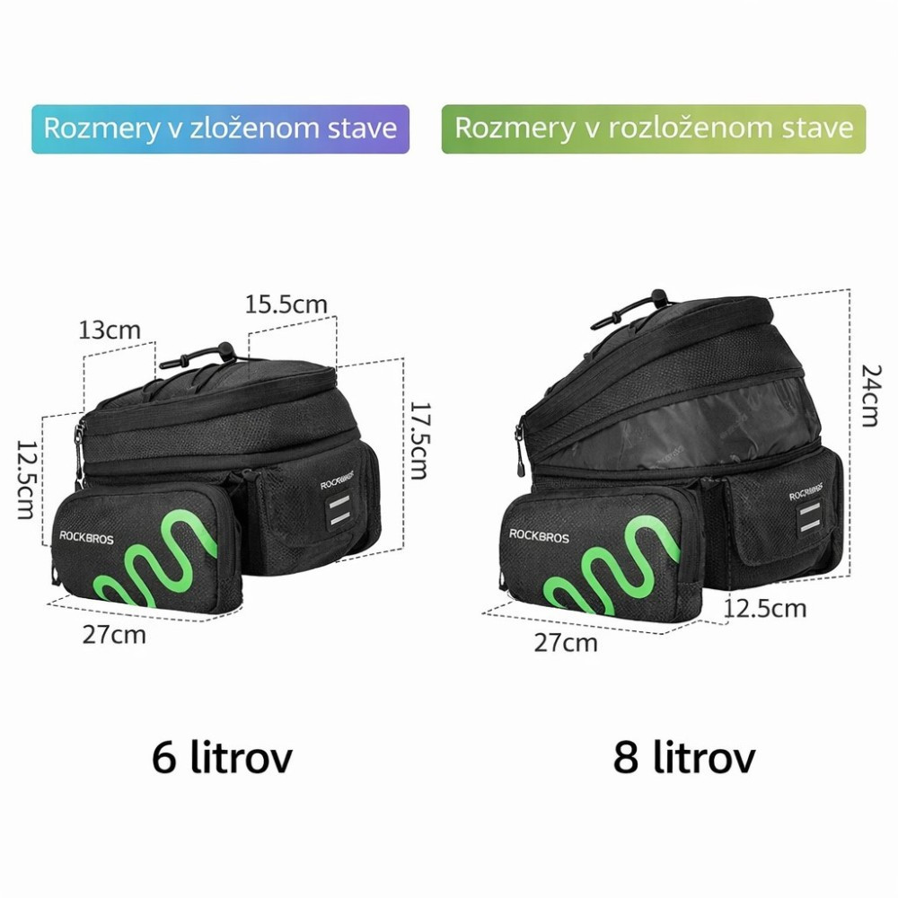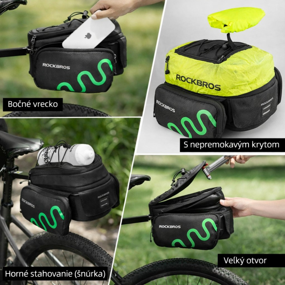 Značka Rockbros – taška na bicykel s reflexným, ochranným krytom proti dažďu, vyrobená z Rip-Stop tkaniny. Nosný duralový nosič s rýchloupevňovacou svorkou, s montážou na sedlovku. Rozmer tašky 280 x 270 x 240 mm. Objem cca 9 litrov. Taška má na zadnej strane držiak na blikačku, po bokoch dve veľké kapsy, na hornej strane elastickú šnúru na batožinu a priečinok s krytom proti dažďu. Súčasťou balenia je aj duralový nosič s rýchloupinákom a reflexný kryt proti dažďu.