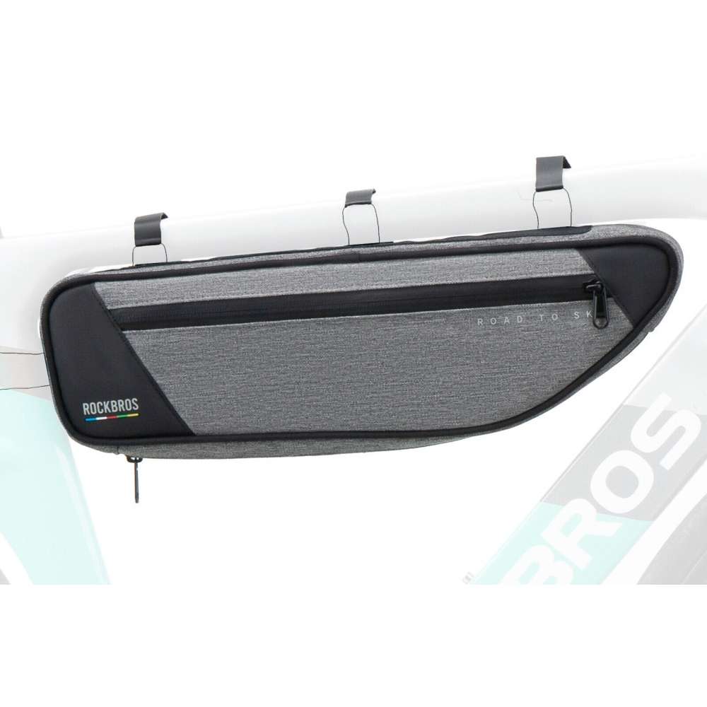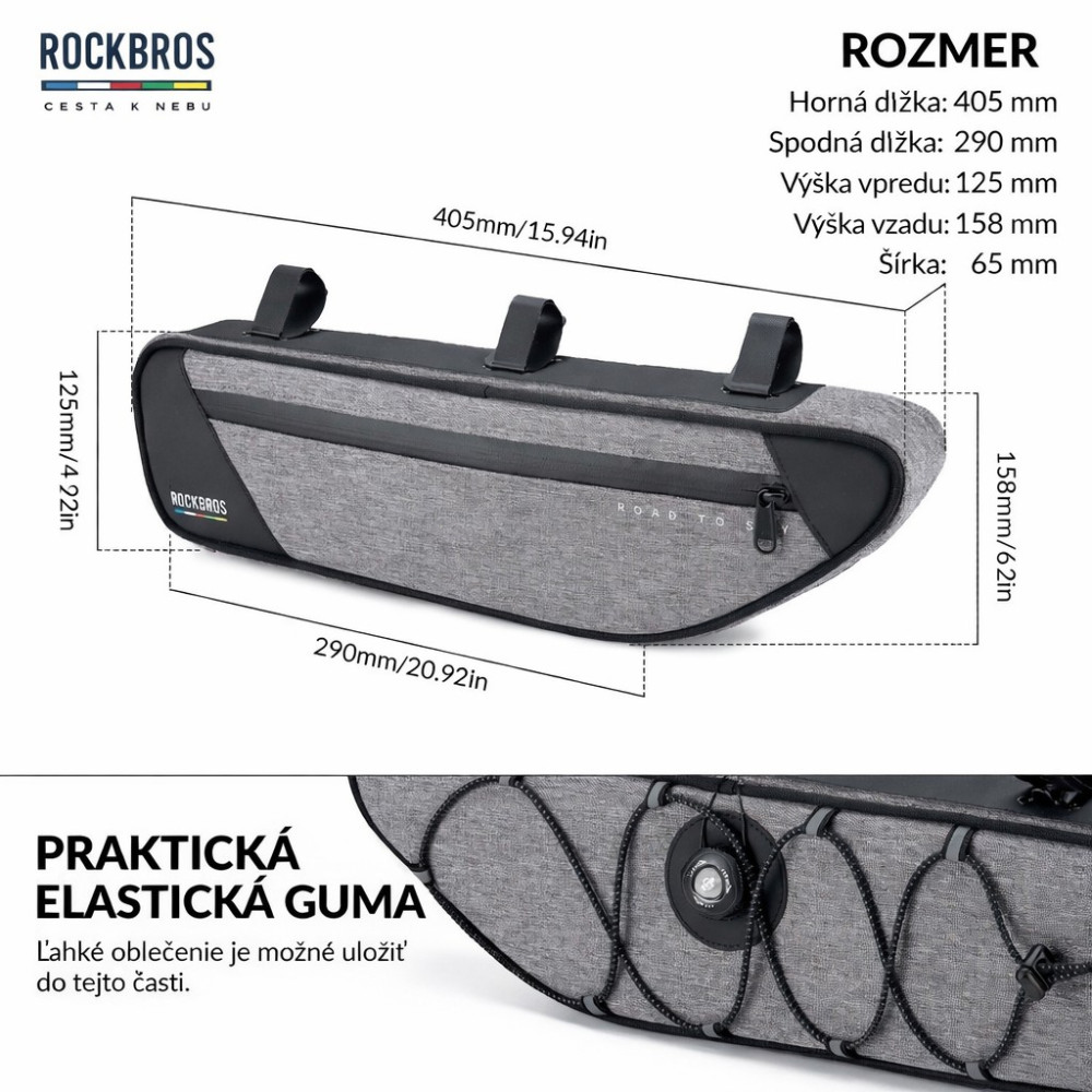 značka Rockbros, Taška do rámu, kapacita 2l. Taška má vlastný upevňovací systém RockFit od Rockbrosu, ktorý sa ľahko inštaluje a fixuje pomocou tlačidla. Systém umožňuje pripevniť tašku do rámu bezpečne, pevne a nárazuvzdorne.Ponúka dostatok priestoru pre váš mobilný telefón, kľúče, náradie, mini pumpu, duše atď. Ideálne na každodenné bicyklovanie. Taška do rámu bicykla je vodeodolná. Dokáže ochrániť vaše veci v miernom daždi. Je vyrobená z polyuretánu (PU) + etylénvinylacetátu (EVA). Je odolná voči opotrebovaniu a trvácna. Kapacita 2litre, hmotnosť 318g, rozmer 40,5x12,5x6,5 cm.