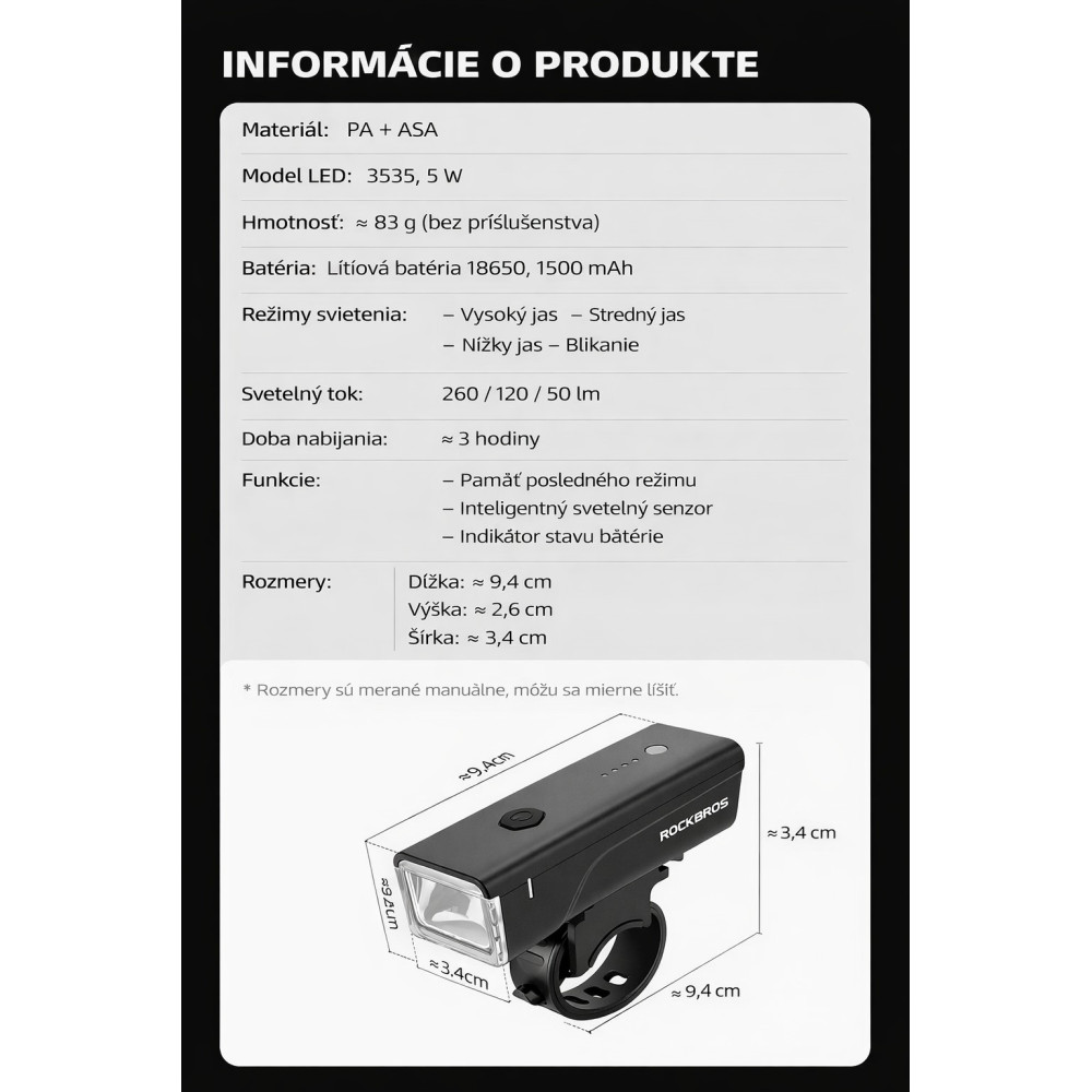 Svetlo predné RB, 260 Lm., USB nabíjanie. V cene výrobku je zahrnutý recykl.pop.pre SR v sume 0,1248 €/kg.