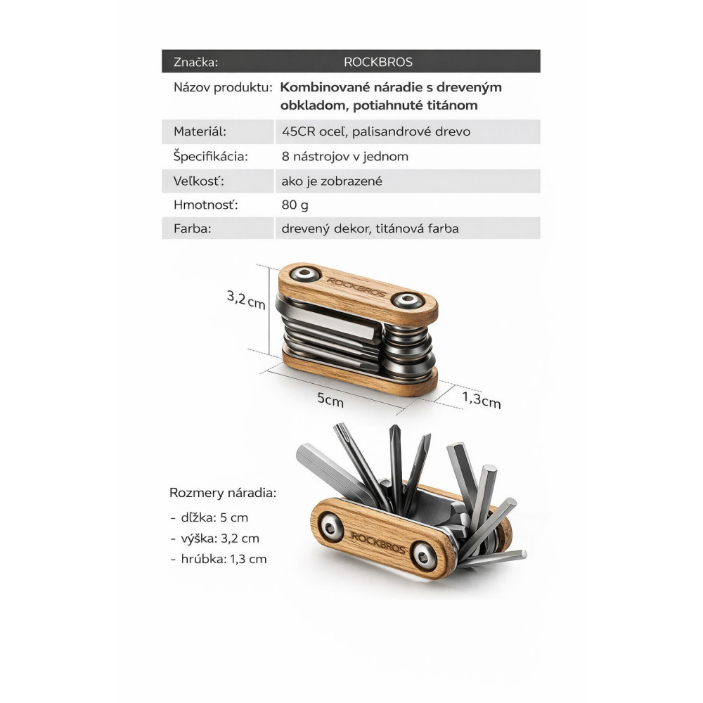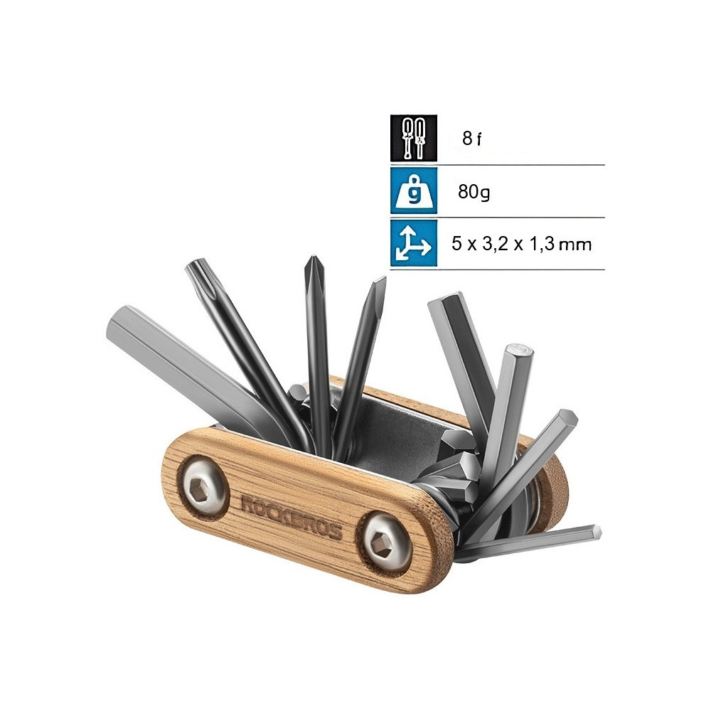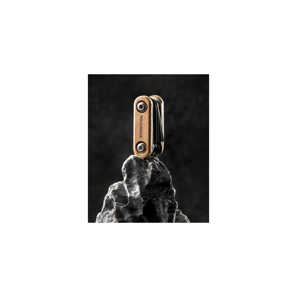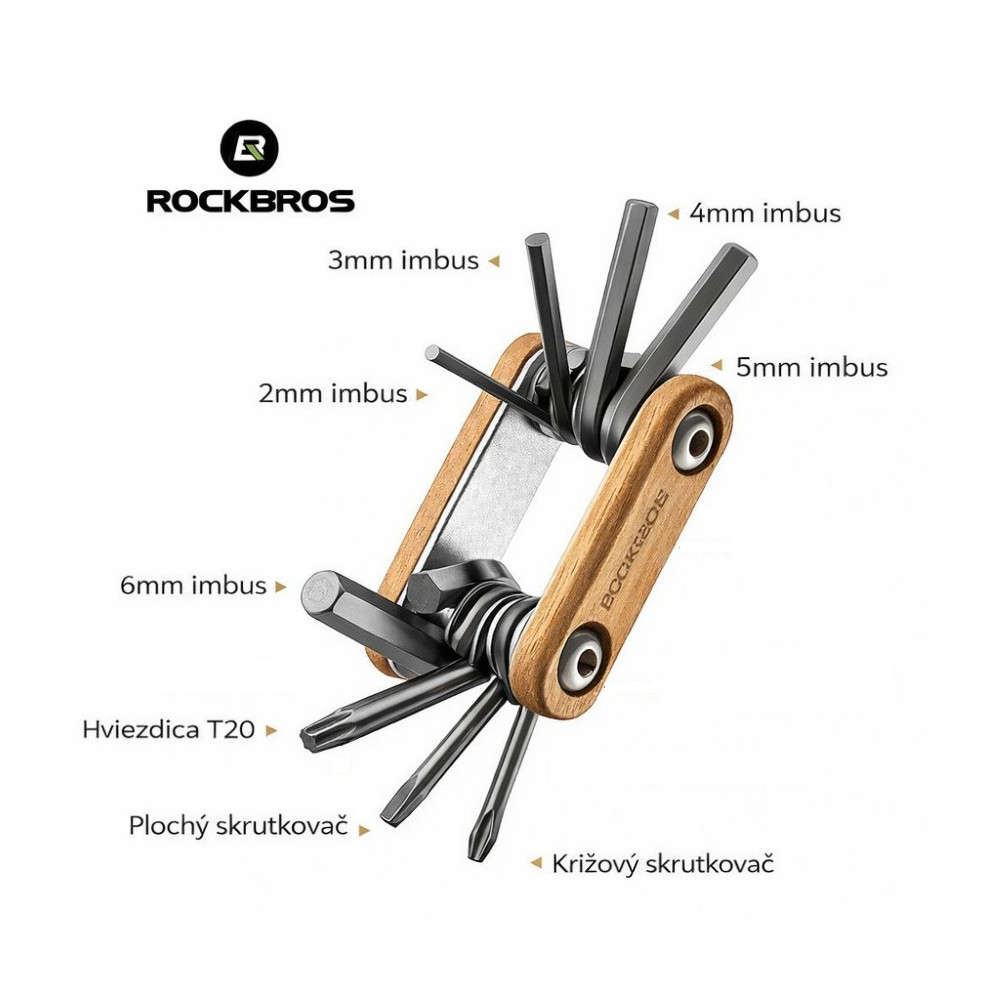 značka Rockbros, prémiová súprava náradia na opravu bicyklov 8 v 1, je vyrobená z legovanej konštrukčnej ocele pokrytej titánom a dreva z palisandra, ktorá je trvácna a odolná voči korózii, pri používaní je schopná vydržať veľkú silu otáčania. Obsahuje imbusový kľúč (2 mm, 3 mm, 4 mm, 5 mm, 6 mm), Torx-20, plochý skrutkovač, krížový skrutkovač.Hmotnosť 80g, rozmery 5 x 3,2 x 1,3 cm, dostatočne mini na to, aby sa dala vložiť do sedlových tašiek, alebo vrecka.
