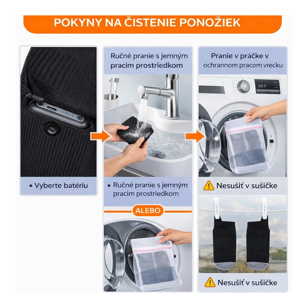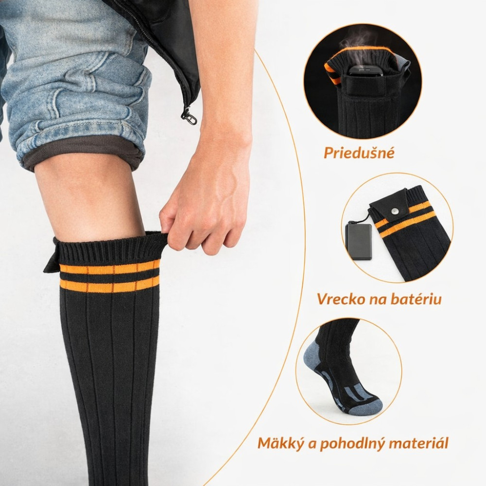 Značka RockBros, elektricky vyhrievané ponožky.Vlastnosti: Hrejivosť, 4 teplotné stupne, mäkké a elastické, jemné spracovanie, vhodné na outdoorové športy.Vždy pri použití skontrolujte úroveň nabitia batérie špeciálnej ponožkovej batérie a úplne ju nabite. Rozlišujte medzi ľavými a pravými ponožkami a noste ich správne. Batériový vak uložte na vonkajšiu stranu holene. Nasaďte si ponožky a zasuňte zástrčku DC do batérie. Potom vložte batériu do priehradky na batérie. Stlačte tlačidlo a rozsvieti sa indikátor batérie a indikátor teploty. Štyri biele svetlá predstavujú zostávajúcu kapacitu batérie. Štyri modré svetlá indikujú teplotu (35/45/55/65°C). Kliknutím na tlačidlo upravíte teplotu podľa potreby (pri najvyššom stupni ohrevu sú všetky svetlá zapnuté). Pre vypnutie ohrevu stlačte tlačidlo vypínača na 2 sekundy. Pri praní by teplota vody nemala presiahnuť 50°C. Pred čistením musíte vybrať batériu. (Upozorňujeme, že batériu nie je možné umývať vodou.) Ponožky musia byť pri praní v práčke vložené do vrecka na bielizeň. Pre vyššiu životnosť ponožiek sa odporúča ručné pranie. Odpojte napájací kábel a vysušte na vzduchu. Nežehlite ani nesušte pri vysokej teplote. BEZPEČNOSTNÉ POKYNY:1.Nahrievajte ponožky len pomocou priloženej batérie.2.Ak batériu často nepoužívate, odporúča sa ju každých 60 dní nabiť a aktivovať.3.Odporúča sa nepoužívať vysoké teploty po dlhšiu dobu.4.Nepoužívajte počas spánku v noci, aby ste predišli popáleniu aj pri nízkych teplotách.5.Keď produkt nepoužívate, odpojte batériu a uskladnite.Nepribližujte sa k horúcim, horľavým alebo výbušným predmetom.Batériu netlačte nasilu, nerozoberajte. Produkt nepoužívajte na terapeutické, alebo iné medicínské účely. Menovité napätie: 5,0V. Menovitý výkon: 5,5W. Doba nabíjania: 5-6 hodín. Prevádzkové časy: 3-8 hodín. Zdroj: 5000 mAh Ponožky disponujú 4 stupňami nastavenia teploty. Spôsob ohrevu: odporový drôt. Teplotný rozsah: 35-65°C. Hlavný materiál: 22,5 % viskózové vlákno, 52,5 % nylon, 10 % polyester, 15 % elastan. Vrátane batérií. Univerzálna veľkosť 36 ( 23 cm ) až 47 ( 34 cm ). Balenie obsahuje: 1 x pár ponožiek, 2 x napájacia batéria, 1 x nabíjací USB kábel pre nabíjanie oboch batérií naraz, vrecko na odkladanie a pranie ponožiek.