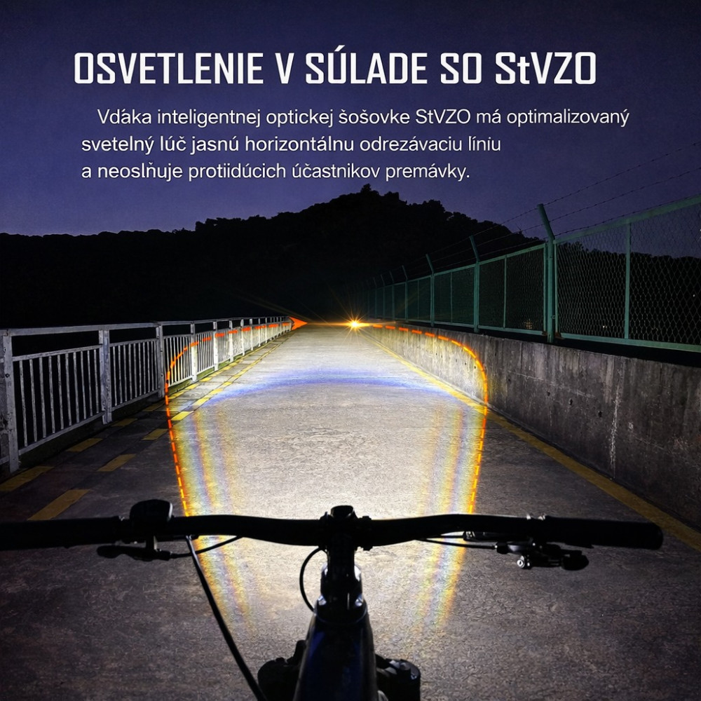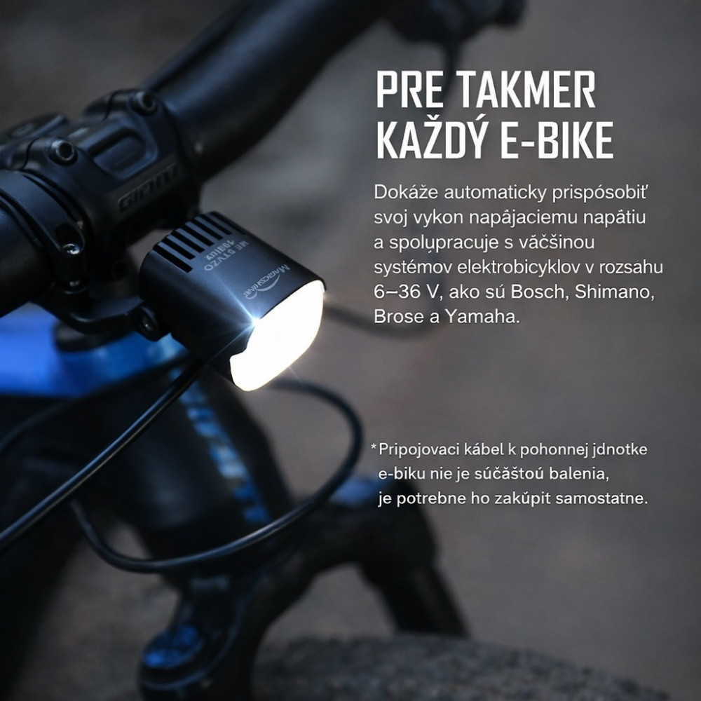Značka Magicshine®, ME StVZO 100LUX / 900 lumen, výkonné cyklistické svietidlo pre E-BIKE s optikou zamedzujúcou oslneniu. Je výkonné cyklistické svietidlo špeciálne vyvinuté pre elektrobicykle s napájaním 6-36V (Bosch, Shimano, Brose, Yamaha) s možnosťou napojenia cez konektor jack na externú batériu, alebo priamo na motor. Ponúka výkon až 100lux (900 lúmen). Vďaka špeciálnej optickej šošovke je ME StVZO vhodné najmä pre mestské alebo cestné využitie, kde je žiaduce zabránenie oslnenia ostatných účastníkov prevádzky. Reálny svetelný výkon až 100lux / 900 lúmen, svetlo spĺňajúce normu StVZO, automatická adaptácia na pripojený E-motor (6v-36v), sférická optická šošovka zamedzujúca oslneniu CUT-OFF Beam, uchytenie na predsadený držiak (držiak je súčasťou balenia), možnosť nastavenia uhla svietenia. Svetlo disponuje špeciálnou optikou, úplne eliminujúce oslnenie ostatných účastníkov prevádzky a spĺňajúce nemeckú normu StVZO. Dosvit až 200 metrov, zdroj LED 3ks OSRAM KW CELNM1.TG. Krytie: IPX6 (striekajúca voda, hustý dážď), hmotnosť svietidla s držiakom: 110g, rozmery svietidla (d/h/š): 45x39x35mm. Pre viac informácií o svetlách si prečítajte priložený Návod na použitie. Vyberte si prepojovací káblik podľa typu motora: Shimano/Bafang, Yamaha, Bosch, Bosch 4.generácia.