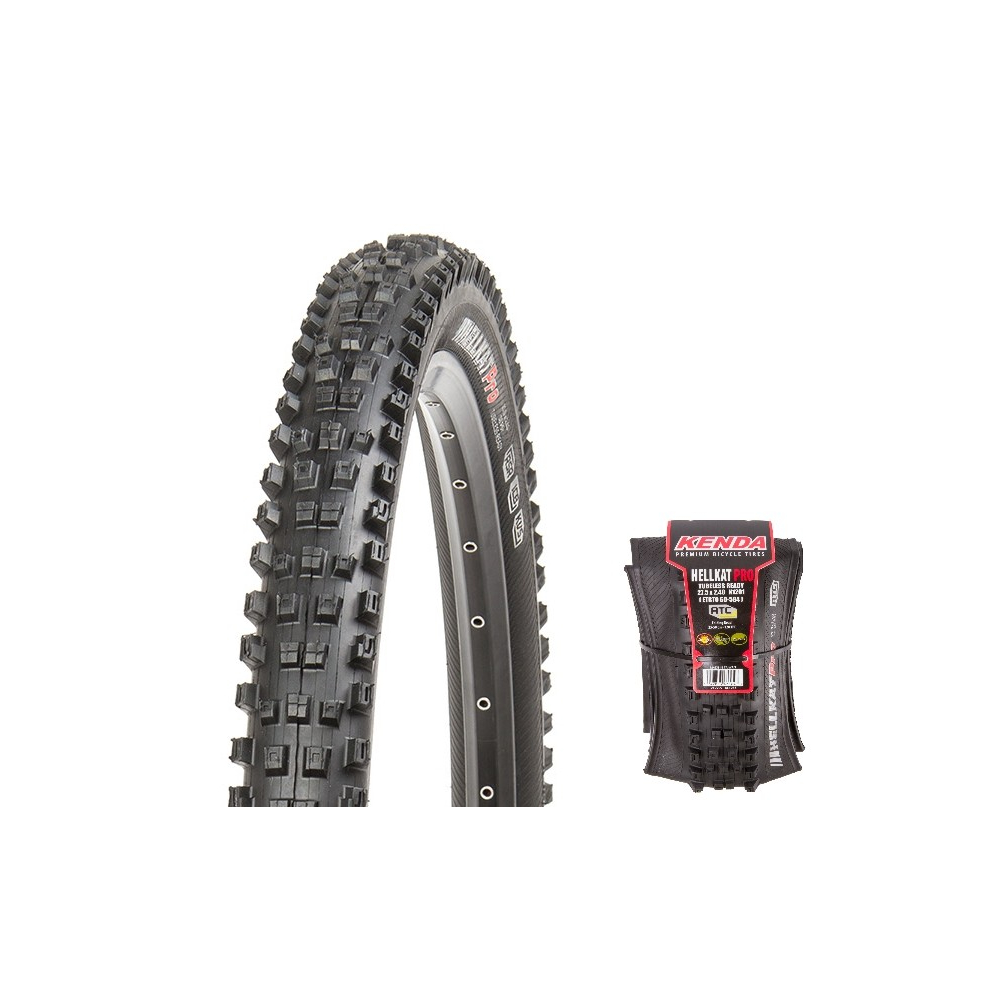 značka Kenda, model Hellkat Pro K-1201, rozmer 29x2,40, 622x60, váha 874g, 120TPI, kevlar skladací, ATC - vyvinutý pre každý druh jazdy na traile. Kombinuje vynikajúcu úroveň ochrany (bočnica a behúň) s priľnavou zmesou pre najlepší možný jazdný komfort. Vhodný plášť aj pre bezdušové kolesá. DT- dvojitá zmes, na karte