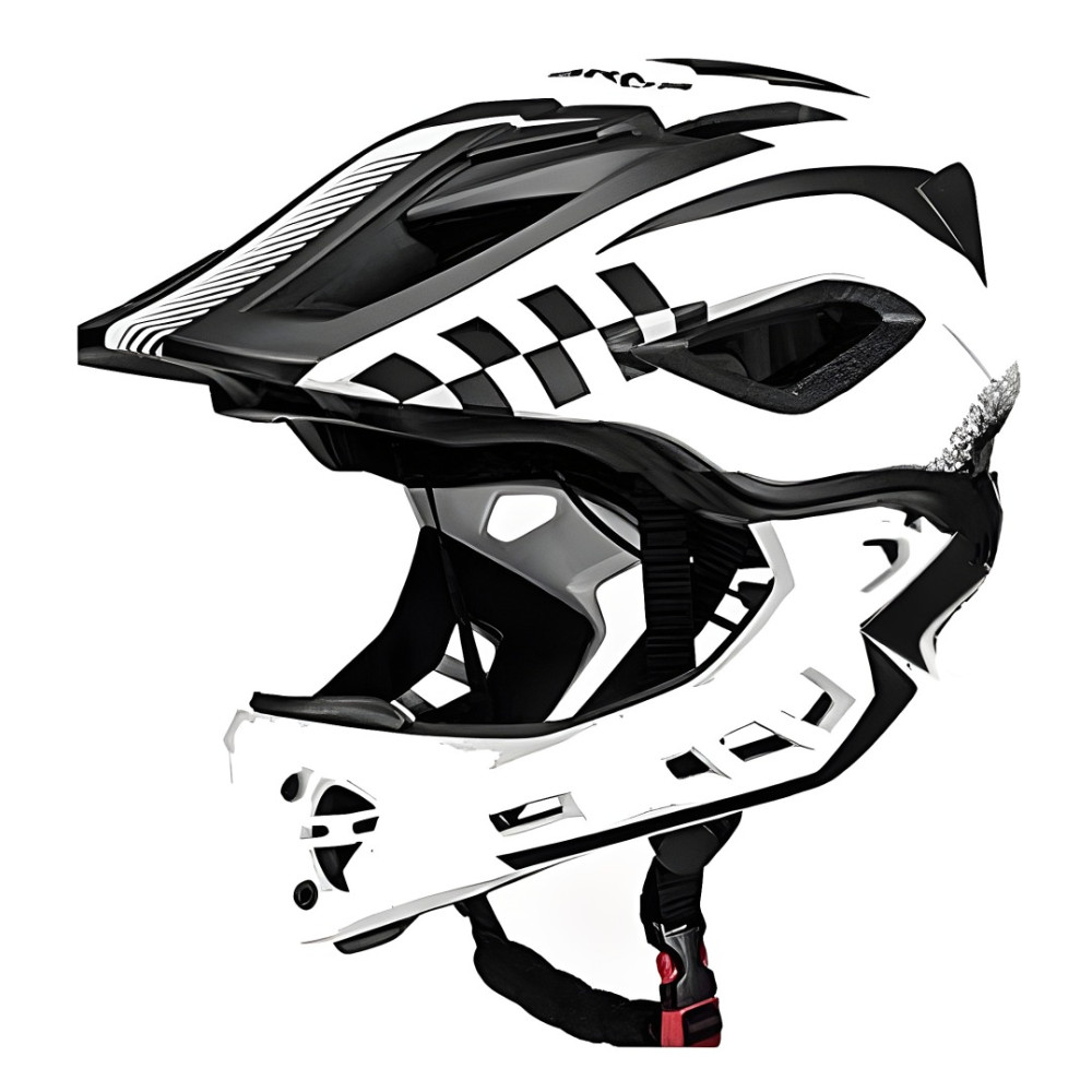 značka Rockbros, endurová prilba pre deti a mládež, veľ. S 48-52cm, váha ca.410g, biela s čiernou potlačou, 12 veľkých otvorov na prilbe, IN-MOULDové prevedenie, s odnímateľným chráničom brady, s integorvaným šiltom, UPOZORNENIE:Prilby nevystavujte teplotám nad 60 stupňov, lebo môže dôjsť k deformácii ! ! !