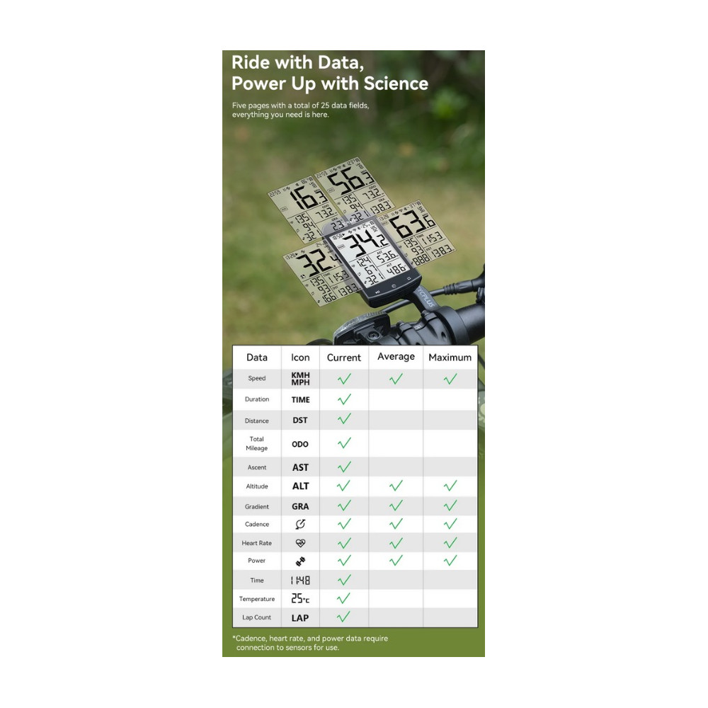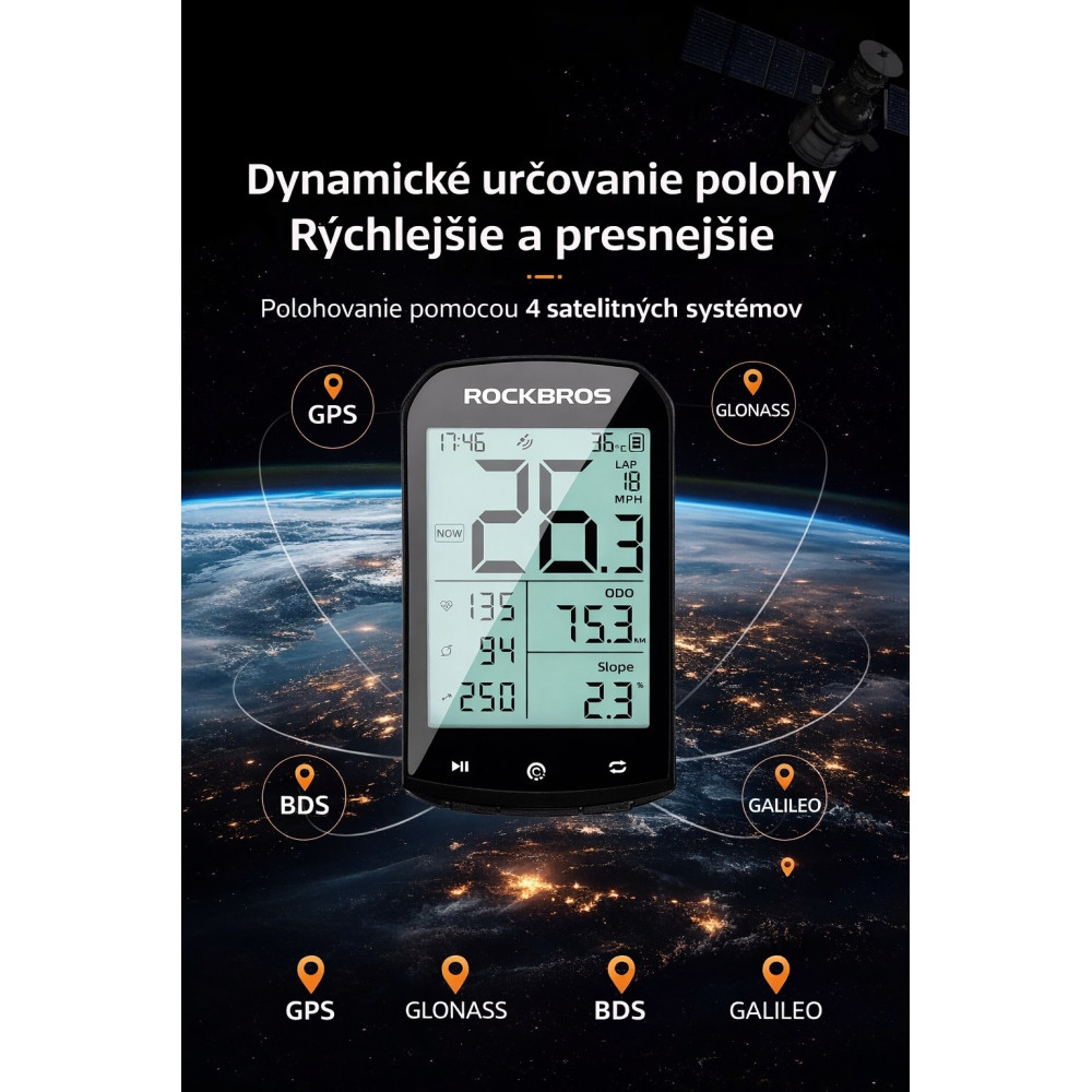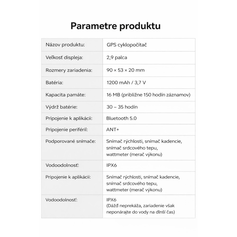 Značka RockBros,GPS cyklopočítač 2,9“ displej, vrátane silikónového púzdra, výškomer, teplomer, výpočet kalórií, funkcia automat. nastavenie času a jasu, meranie rýchlosti, priemernej rýchlosti, maximálnej rýchlosti , meranie prejdenej vzdialenosti, meranie vzdialenosti, meranie celkového času jazdy, meranie času pohybu, počítanie okruhov atď.(pozri priložený obrázok) Má zabudovaný polohovací systém s vyššou citlivosťou, presnosťou a rýchlejším polohovaním. Podporuje satelity GPS, GLONASS, GALILEO, BeiDou. GPS umožňuje sledovanie polohy v reálnom čase, poskytuje presné informácie o trase pre hladkú a bezpečnú jazdu. Simultánne zaznamenáva rýchlosť, srdcový tep, najazdené kilometre, kadenciu a ďalšie údaje.Na záznam tepu, kadencie a power metra sú nutné externé senzory. To vám pomôže plne porozumieť vášmu stavu jazdy a monitorovať váš fyzický stav v reálnom čase. Zároveň podporuje externé zariadenia s protokolom ANT+ a ponúka tak ďalšie možnosti funkčného rozšírenia. Bluetooth, USB nabíjateľný, podpora Androidu a iOS, podpora v APP, rozhranie zariadenia v EN, podpora APP XOSS Strava a Training Peaks. S veľkým 2,9-palcovým LCD displejom je možné rýchlo a jasne čítať údaje. Cyklopočítač má funkciu automatického podsvietenia, ktorá sa automaticky zapína v závislosti od časového pásma a času, aby vyhovovala potrebám nočného videnia. S ultra veľkou kapacitou batérie 1200 mAh môže cyklocomputer pracovať nepretržite 35 hodín. Vďaka portu na rýchle nabíjanie Type-C trvá úplné nabitie len 3 hodiny. Životnosť batérie bez problémov spĺňa požiadavky každodenného bicyklovania. Krytie IPX6, vodotesný. Bezdrôtový dizajn.
