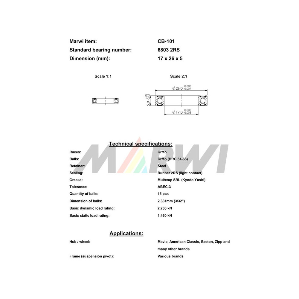 Ložisko CB-101 6803 2RS, 17x26x5 do náboja, ks