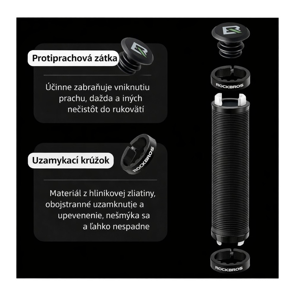 značka Rockbros, materiál špeciálna dvojzložková zmes, prvá tvrdý plast vo vnútri pre dobré spojenie s riadidlom, druhá vonkajšia TPE kratón, mäkká zmes pre komfort a tlmenie nárazov, ukončenie rukoväte dvoma duralovými objímkami, farba čierna, dĺžka 130 mm, jednoduché uchytenie na riadidlo pomocou imbusovej skrutky na objímkach, balené v krabičke Rockbros.