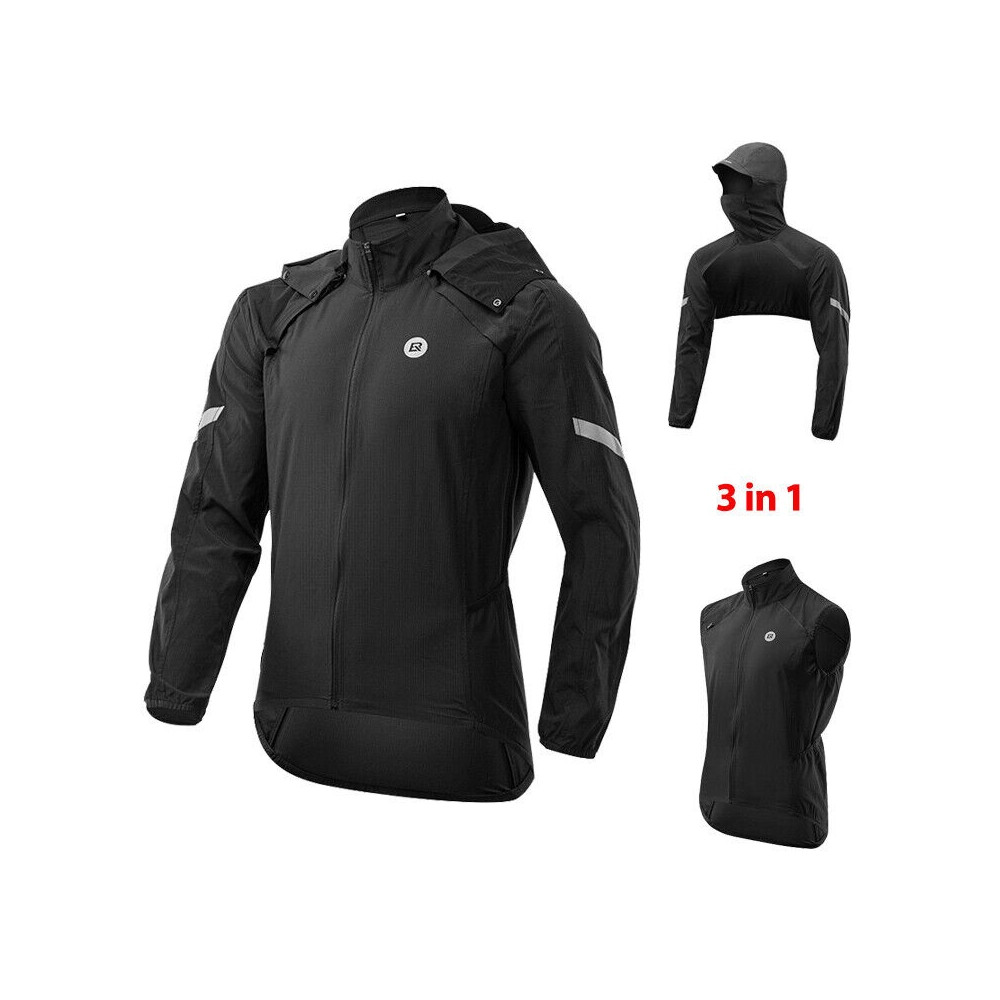 Značka RockBros, cyklistická bunda 3 v 1 s kapucou, vetruodolná s odnímateľnými rukávmi. Je priedušná, elastická, ľahká. Odnímateľné rukávy umožňujú bundu použiť ako vestu. Jedno oblečenie a tri možnosti použitia. 1. Možnosť s dlhým rukávom (teplá ochrana a ochrana pred slnkom, vhodné na jarné a jesenné jazdenie). 2. Možnosť - Vesta (priedušná, pohodlnejšie jazdenie). 3. Možnosť - Top bez chrbta (voľné nastavenie, ochrana pred slnkom ). Veci si môžete uložiť do dvoch zadných otvorených bočných vreciek a jedného zadného vrecka so zipsom. Elastická šnúra umožňuje ľubovoľné nastavenie obvodu kapucne. Reflexný dizajn. Priedušná sieťovina na bokoch. Materiál RIP Stop, 92% polyester a 8% elastán.