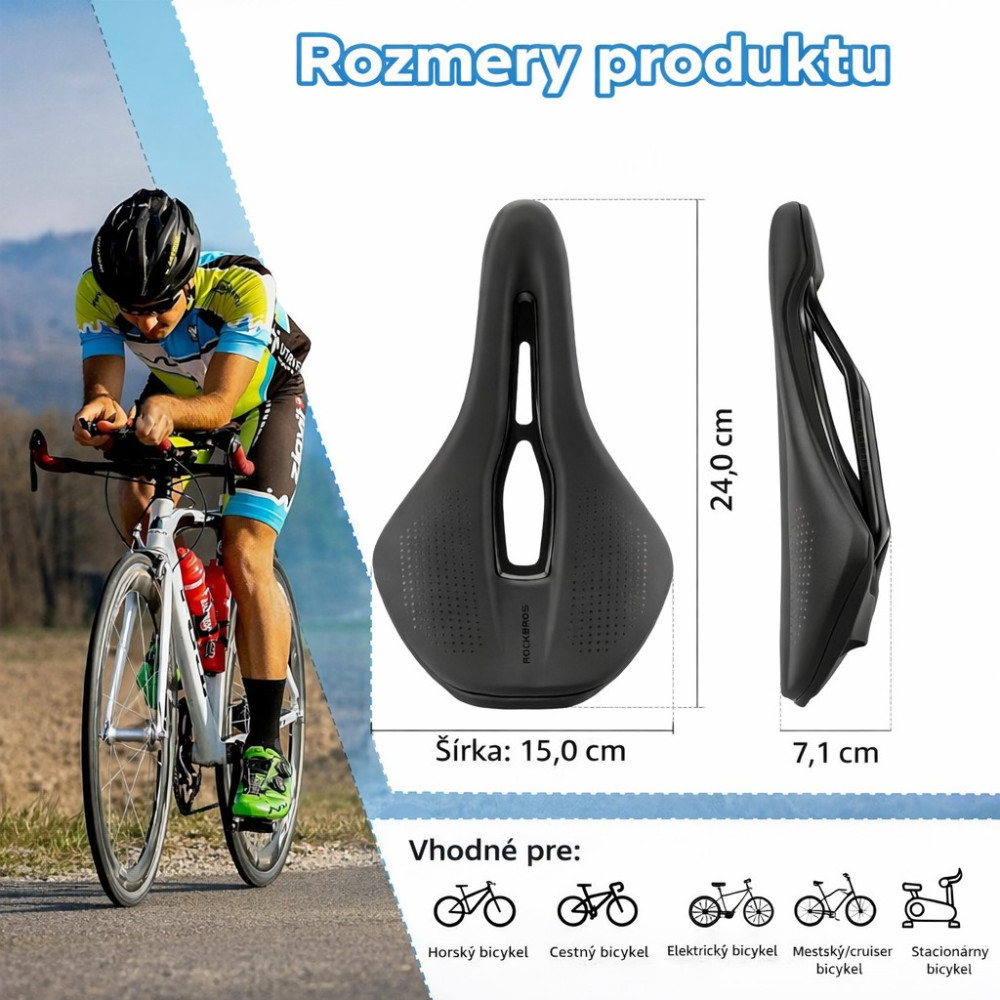 Značka RockBros, sedlo na bicykel Cr-Mo, nylon tlmiace nárazy. Má ergonomický dizajn, znižuje tlak na boky pri bicyklovaní. Je vyplnené pohodlnou penou. Rozšírené plochy na sedenie, ktoré tiež znížujú príznaky necitlivosti pri dlhšej jazde. Má ventilačný otvor v strede sedla na cirkuláciu. Technológia odpruženia sedla poskytuje nielen pohodlnú silnú oporu, ale aj tlmenie nárazov a zachovanie flexibility. Povrch sedla je vyrobený z PU kože s vysokou hustotou. Koža zabraňuje navlhnutiu vnútornej peny, strate elasticity. Protišmykové bodky na povrchu účinne zvyšujú trenie. Pevná základňa je z nylonu. Hmotnosť 275 g.