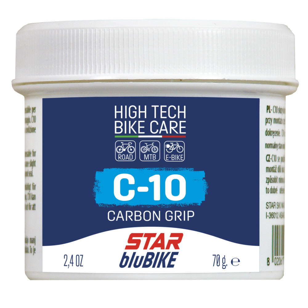 značka STAR bluBIKE, Carbon grip je karbónové mazivo na bicykel, špeciálny produkt určený na mazanie a ochranu dielov, ktoré sú vyrobené z karbonových materiálov, ako sú rám, vidlica alebo ďalšie komponenty bicykla. Karbónové komponenty sú často citlivé na nadmerný tlak a trenie, ktoré môže viesť k poškodeniu alebo prasknutiu. Mazivo znižuje riziko poškodenia počas montáže a demontáže. Zaisťuje lepší kontakt medzi rôznymi dielmi (napríklad medzi karbonovým rámom a sedlovkou, predstavcom a riadidlom…), čo zlepšuje prenos sily a stabilitu. Karbónové mazivo zabraňuje zarezaniu komponentov do seba, čo je obzvlášť dôležité pri nastavení a upevňovaní karbonových dielov. Chráni pred koróziou a degradáciou komponentov, najmä v oblastiach, kde sú kovové časti v kontakte s karbonom. Zlepšuje dlhodobú životnosť komponentov a znižuje potrebu častých opráv a výmeny poškodených častí. Naneste malé množstvo maziva na miesta, kde sa karbonové diely spájajú s inými komponentmi (napríklad medzi sedlovkou a rámom alebo predstavcom a riadidlami).Pred aplikáciou maziva je dôležité, aby boli povrchy čisté a suché, aby sa zabezpečila efektívna aplikácia a maximálny výkon maziva. Karbónové mazivo je nevyhnutné pre tých, ktorí používajú karbónové komponenty na bicykli a chcú zachovať ich bezpečnosť, výkon a dlhú životnosť. Môže spôsobiť miernu abráziu na kontaktných miestach. To je úplne normálne a umožňuje pevný spoj. Objem 70g.