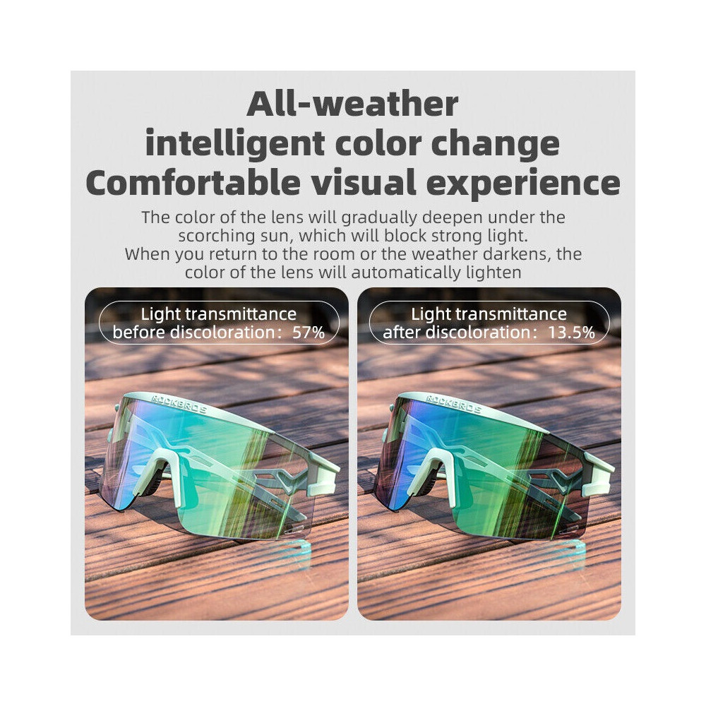 značka Rockbros, okuliare fotochromatické, ochrana UV400, rámik vyrobený z TR materiálu, okuliare automaticky tmavnú podľa intenzity UV žiarenia, balenie obsahuje handričku z mikrovlákna, vrecko z mikrovlákna, myopia ramik, tvrdé ochranné púzdro okuliarov. Hmotnosť 30g.