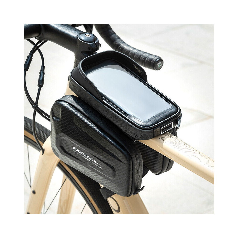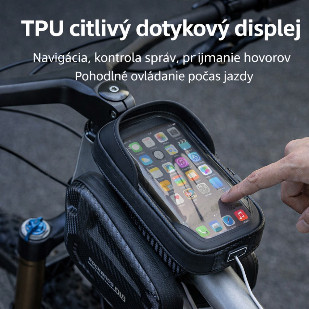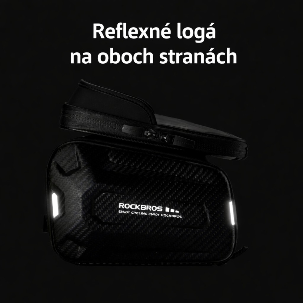 značka Rockbros, taška na hornú rámovú trubku s tvrdou škrupinou, vyrobená z vodotesného materiálu polyuretánu (PU) a etylénvinylacetátu (EVA). Vodotesný zips. Taška je odolná proti dažďu aj vďaka vodotesným zipsom. Stredne veľká kapacita: 2ks bočné tašky 12 × 18 x 4 cm a 1ks vrchná taška 11 x 19 x 3 cm. Cca 1,3 l. Taška je dostatočne veľká pre každodennú cyklistiku. Môžete do nej vložiť svoje veci ako mini pumpu, smartfón, peňaženku, kľúče atď. Jednoduchá inštalácia, s 3 suchými zipsami ju veľmi pevne pripevníte k rámu. Ľahká demontáž je samozrejmosťou, keď opustíte bicykel. Ak sú suché zipsy príliš dlhé, môžete ich odstrihnúť. Ochranná clona redukuje slnečné svetlo a display možno ľahko vidieť. Vrchný diel s telefónom je ľahko odnímateľný a upevňuje sa pomocou suchého zipsu. Mobilný telefón môžete bez problémov používať vďaka vysoko citlivému, priehľadnému TPU priezoru bez toho, aby ste museli mobil vybrať z tašky. Je vhodná pre smartfóny veľkosti pod 7 palcov. Hmotnosť 368g.