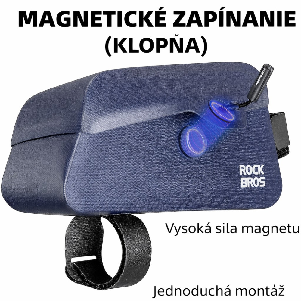 Značka RockBros® , vodotesná, magnetická, cyklistická taška je navrhnutá pre pohodlné uchytenie na hornú rámovú trubku a predstavec bicykla. Bezšvová technológia výroby. Spoje sú zvárané. Je ideálnym riešením pre tých, ktorí potrebujú mať svoje drobnosti po ruke počas jazdy. Taška je vybavená inovatívnym magnetickým otváraním, ktoré umožňuje rýchly a bezpečný prístup k obsahu aj počas jazdy, pričom magnety pevne držia zatvorený stav tašky. Tento praktický systém zároveň eliminuje potrebu zložitého zipsovania alebo iných mechanizmov. Taška poskytuje dostatok priestoru na ukladanie základných vecí, ako sú telefón, kľúče, nástroje alebo energetické tyčinky. Vďaka svojej kompaktnosti nebráni v pohybe a jej dizajn minimalizuje aerodynamický odpor. Je vyrobená z kvalitného a odolného materiálu, ktorý odoláva poveternostným vplyvom, čo ju robí ideálnou pre každodenné použitie, či už v mestskom prostredí, alebo na dlhších cyklistických výletoch. Taška je jednoducho pripevniteľná a odnímateľná, čo zabezpečuje pohodlné používanie. Materiál: nylon. Rozmer cca 220 x 90 x 60 mm. Kapacita cca 0,9 litra.