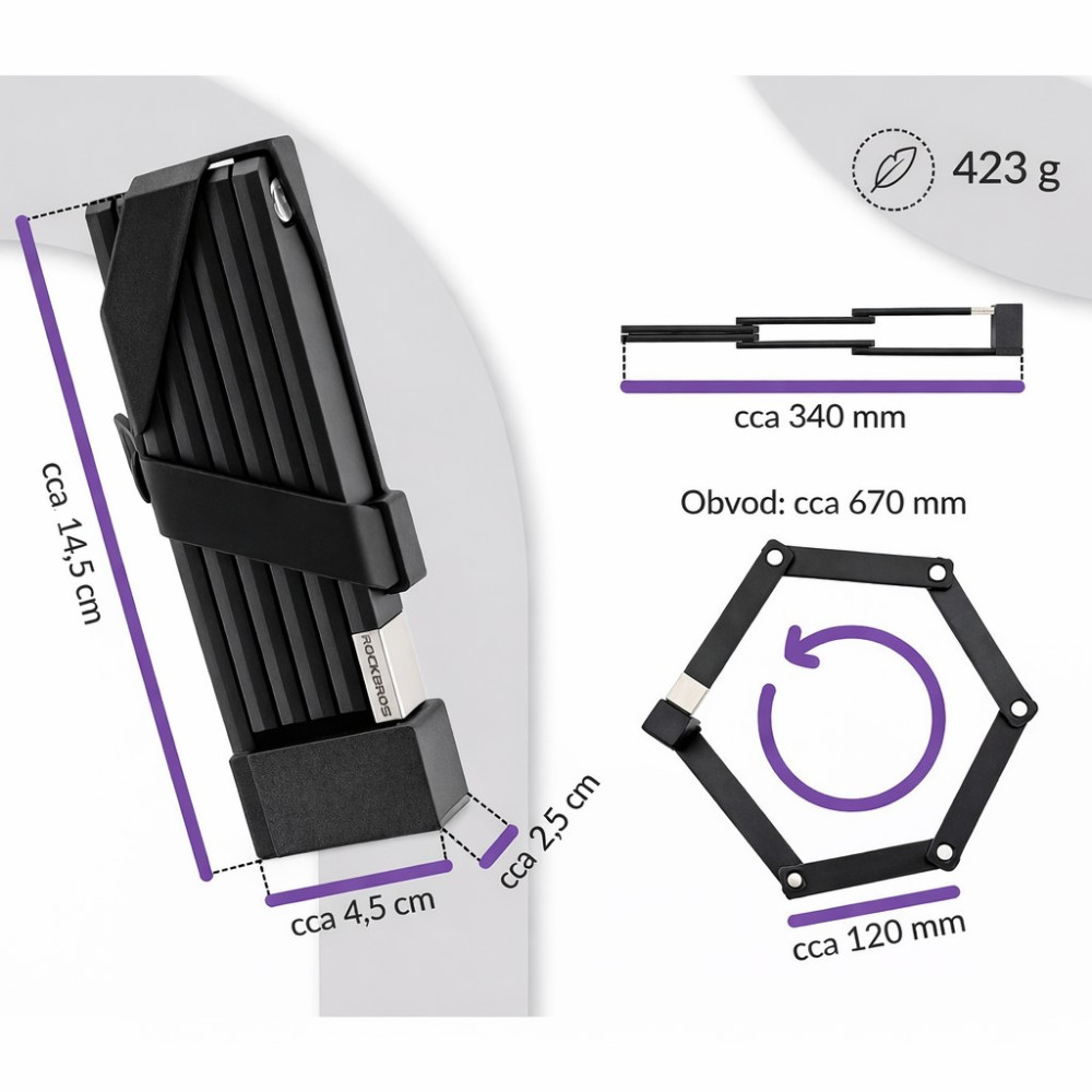 Značka Rockbros - zámok skladací (6 článkov) na bicykel, Heavy Duty, obalený PP materiálom proti otlčeniu rámu bicykla. Zámok sa montuje pomocou konzoly na rám bicykla. Zámok je vyrobený z odolnej zliatiny zo šiestich článkov, ktoré sú odolné proti strihaniu, píleniu, vŕtaniu. Dĺžka článku 12 cm. Celková dĺžka 67 cm. Rozmer zloženého zámku 14,5 x 4,5 x 2,5 cm. Hmotnosť 423 g.
