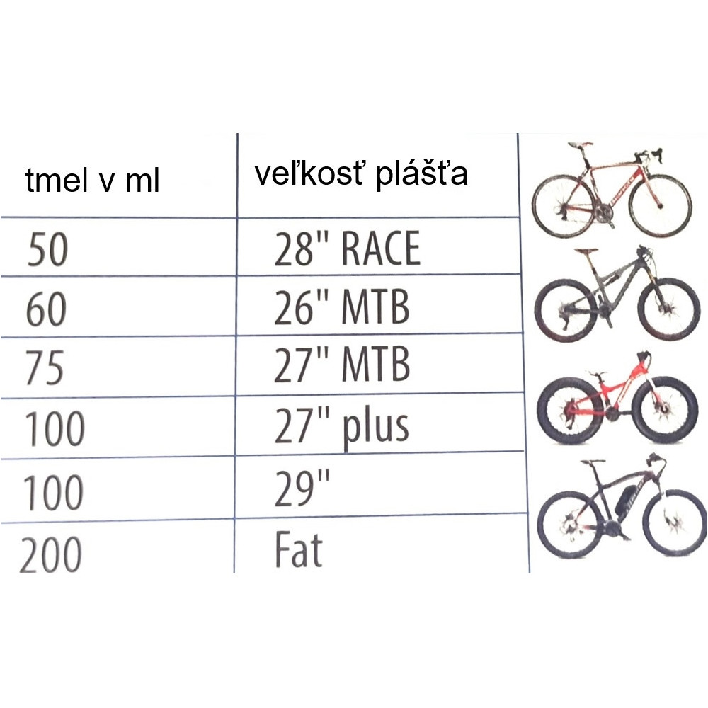 značka STAR bluBIKE, Taliansko, okamžite utesňuje defekty do 6 mm na dušiach a bezdušových plášťoch bicyklov. Tmel do pneumatík od Star BluBike je obľúbený medzi cyklistami vďaka svojej vysokej kvalite a niekoľkým výhodám, ktoré ho odlišujú od produktov iných výrobcov. Hlavné dôvody, prečo je tento tmel považovaný za lepší, sú: vysoká účinnosť pri oprave defektov. BluBike do pneumatík je navrhnutý tak, aby efektívne uzatváral defekty spôsobené prepichnutím kameňmi, tŕňmi a inými ostrými predmetmi. Tento tmel má vynikajúce tesniace vlastnosti, ktoré mu umožňujú rýchlo vytvoriť trvalú opravu, a to aj pri väčších prierazoch (do cca 6 mm v prípade plášťov horských bicyklov). Tmel BluBike má ideálnu hustotu, čo znamená, že sa rovnomerne rozprestiera po vnútornej strane pneumatiky a vytvára spoľahlivú ochrannú vrstvu. Táto konzistencia zároveň vyvažuje koleso, čo zaisťuje plynulú jazdu. Tmel je navrhnutý tak, aby si zachoval svoje účinné vlastnosti po dlhšiu dobu, aj v náročných podmienkach, ako sú extrémne teploty. To znamená, že nevyžaduje časté dopĺňanie, čo šetrí čas a peniaze. Tmel Bluebike je vyrobený z ekologických a bezpečných materiálov, ktoré neobsahujú toxické látky. To ho robí vhodným aj pre cyklistov, ktorí dbajú na udržateľnosť a minimálny dopad na životné prostredie. Tmel je veľmi odolný voči rôznym teplotám a vlhkosti, čo znamená, že nezasychá a funguje efektívne aj pri vyšších teplotách počas leta, aj v chladnejších podmienkach v zime. Tmel BluBike je šetrný, nepoškodzuje plášte ani duše, čo zabezpečuje dlhšiu životnosť týchto komponentov. Tieto vlastnosti robia z tmelu od BluBike vynikajúcu voľbu pre cyklistov, ktorí hľadajú spoľahlivý, efektívny a ekologický produkt na prevenciu a opravy defektov. Pred použitím fľaštičku pretrepte a tmel aplikujte cez ventil (ak sa nedá odobrať) alebo nalejte cez zdemontovaný ventil priamo do duše alebo plášťa. Tmel zostáva aktívny po dobu až 6 mesiacov. Aktívne až do -15 stupňov. Objem 120 ml. Vhodné až do veľkosti kolesa 29”