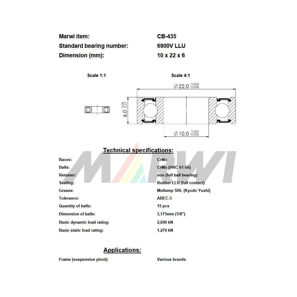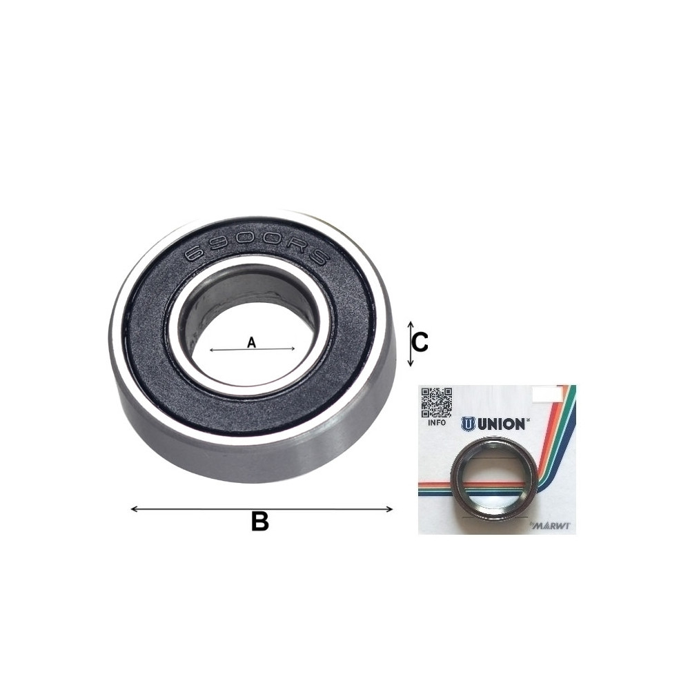 značka Union, Ložisko 6900V LLU, A-10 x B-22 x C-6 mm, CB-435 do rámov - pivot. Jednoradové guľkové ložisko vysokej kvality s jednoduchou konštrukciou. Je nerozoberateľné a bez plniaceho otvoru, po obidvoch vnútorných stranách oceľových krúžkov má hlboké obežné dráhy, takže dosahuje relatívne vysokú únosnosť a môže zachytávať radiálne i axiálne zaťaženia v obidvoch smeroch. Je vhodné aj pre vysoké frekvencie otáčania., kontaktné gumové tesnenie z obidvoch strán , vhodné pre prevádzkovú teplotu od -40 °C do +100 °C.