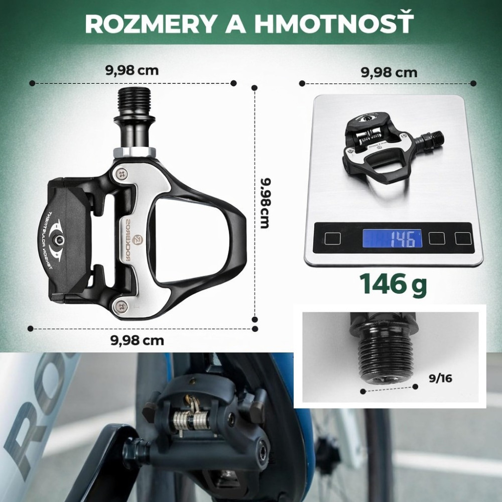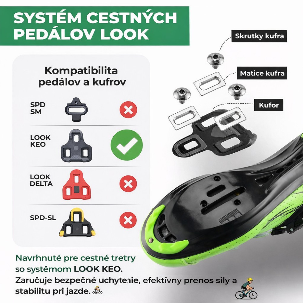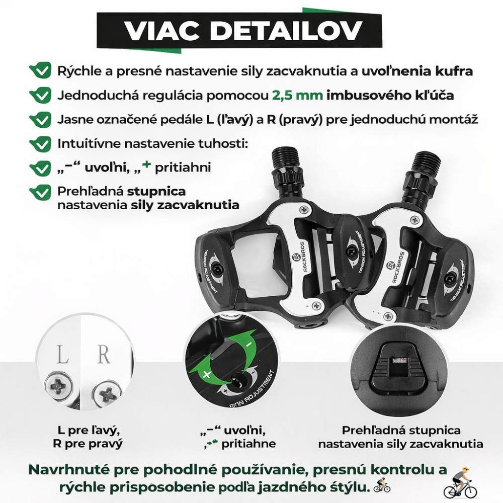 Značka RockBros, pedále Look KEO – ľahkosť, výkon a presnosť pre cestné bicykle. Chcete zo svojich jázd vyťažiť maximum? Pedále RockBros Look KEO sú ideálnou voľbou pre pretekárov aj vášnivých cestných cyklistov. Prinášajú ľahkú konštrukciu, vysokú stabilitu a spoľahlivý prenos sily pri každom šliapnutí. Odľahčené nylonové telo so širokou platformou: menšia hmotnosť, rovnomerné rozloženie záťaže a maximálna stabilita. Nastaviteľné napätie pružiny: individuálne prispôsobenie sily pri nacvaknutí a uvoľnení – ideálne pre začiatočníkov aj profesionálov. Osa z CrMo ocele + ihličkové ložiská: dlhá životnosť, hladký chod a odolnosť voči poveternostným vplyvom. Kompletná sada pripravená na montáž: v balení nájdete aj kufre - Cleats (4,5°) so značkami pre ľahšiu orientáciu pri inštalácii. Optimalizované pre cestné bicykle: systém Look KEO zabezpečuje efektívny prenos energie a vysokú rýchlosť na každej trati. Pedále spájajú ľahkosť, spoľahlivosť a výkon – všetko, čo cestný cyklista potrebuje. Hmotnosť pedálov 304 g.
