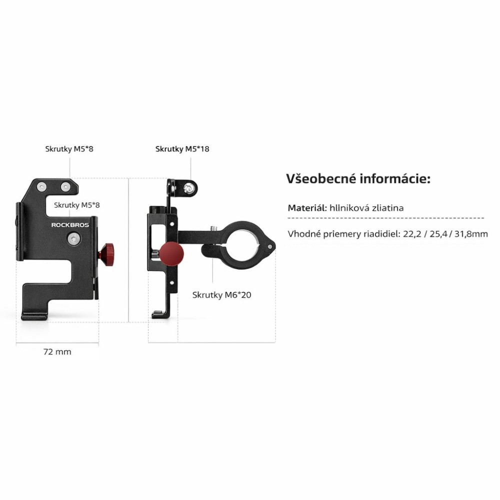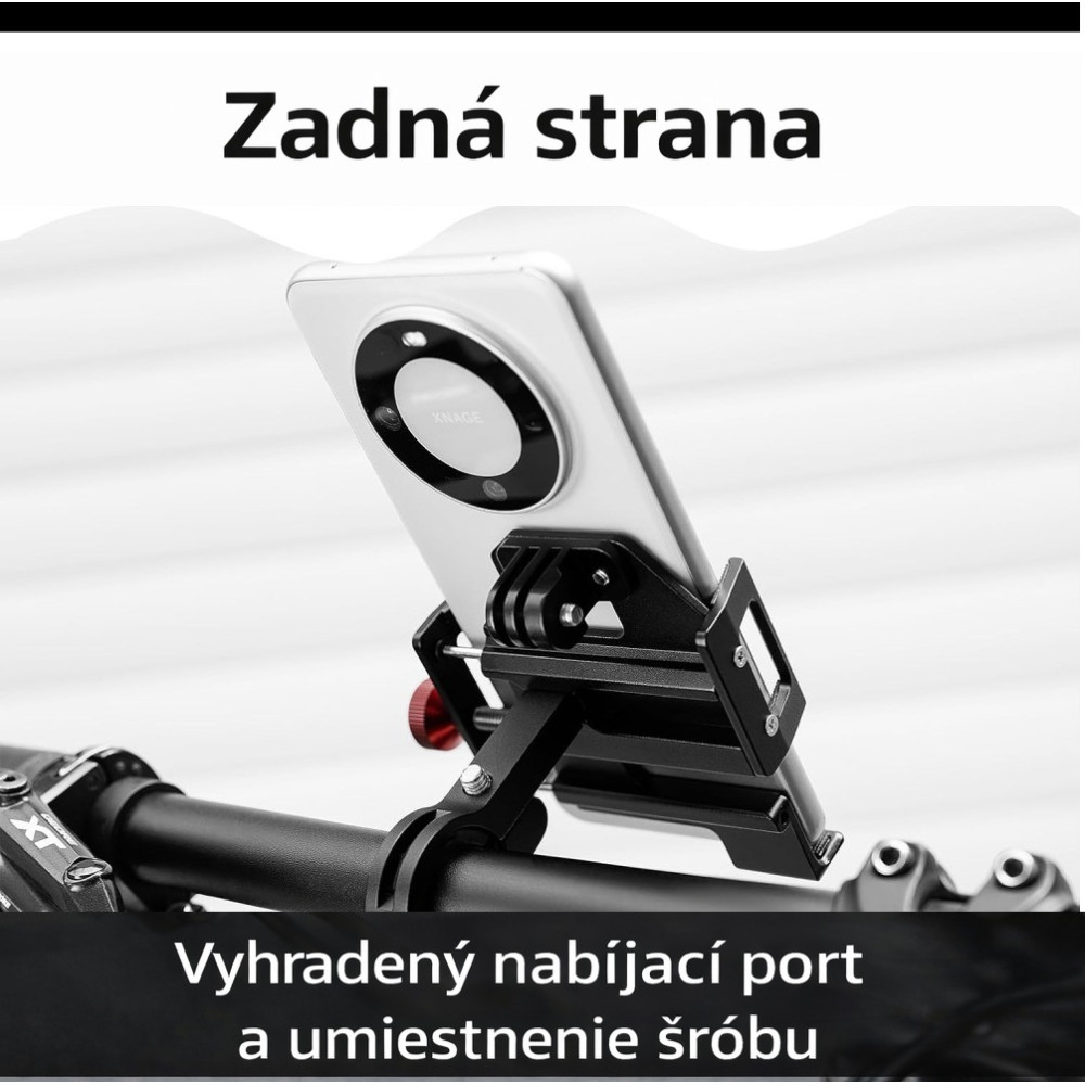 značka Rockbros, materiál : odolný dural, pre rôzne druhy telefónov, otočný o 360 stupňov, s funkciou zafixovania polohy, so silikónovou výstelkou, pre riaditka 22,2 až 31,8 mm. Vhodný pre smartfóny s uhlopriečkou 4,7” až 7,1”. Držiak mobilu má vpredu adaptér na upnutie rôznych zariadení, napr. GoPro kamery, alebo zdola upínané svetlo… Váha 190 g, balené v krabičke.