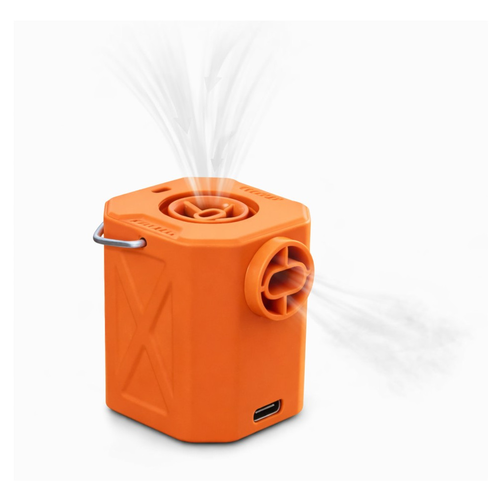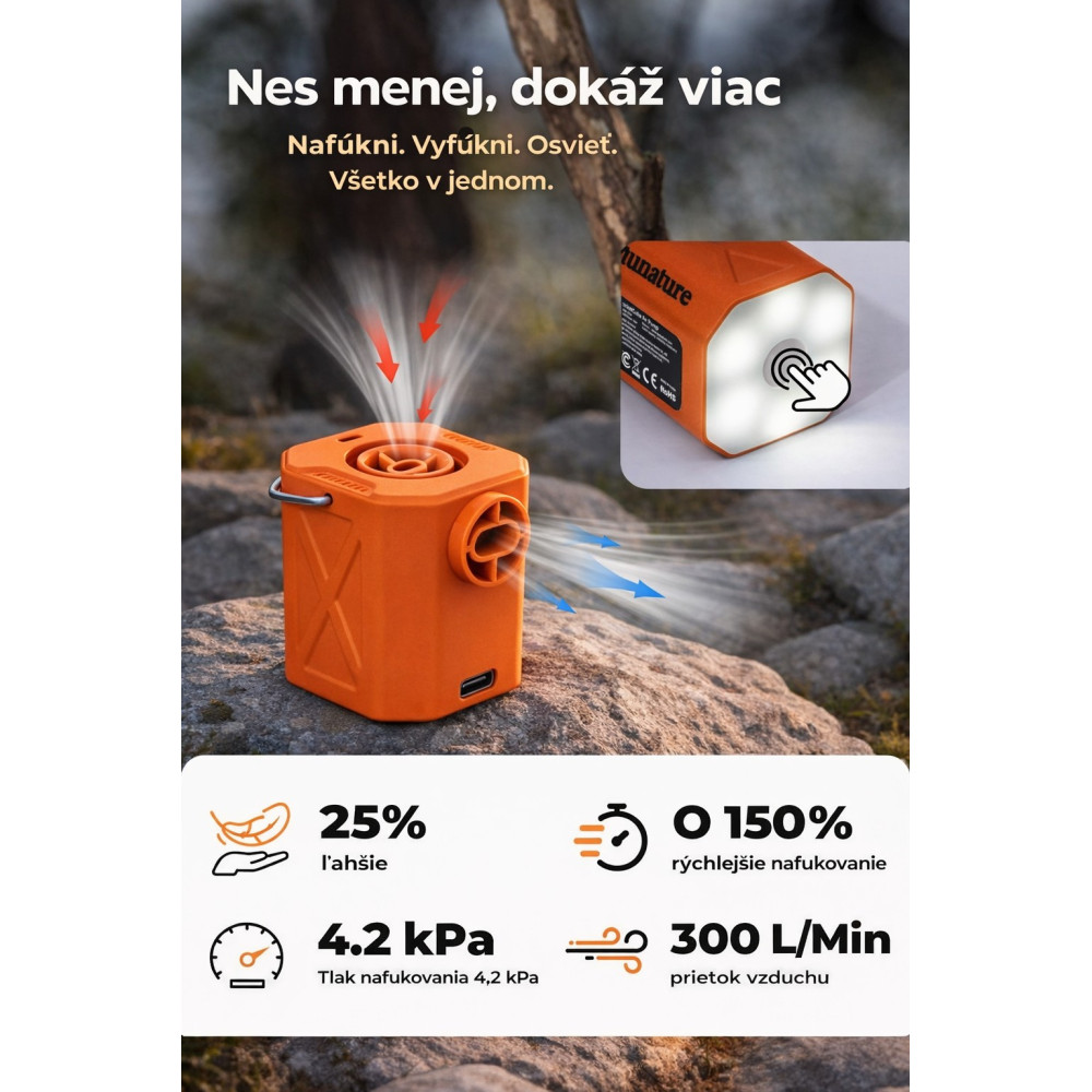 Značka RoskBros, Mini Elektrická Nafukovacia Pumpa so Svetlom 300Lm, tlak 4,2 kPa, batéria 800 mAh, prenosná so závesným háčikom, na nafukovanie a vyfukovanie matracov, nafukovačiek…Ultrakompaktná, USB pumpa na nafukovacie predmety je skutočný prielom, VÁŽI IBA 45 g, čo je menej než vajce. So svojimi malými rozmermi 37×40,6×45 mm sa jednoducho zmestí do tvojho batohu alebo dokonca do vrecka na nohaviciach. Či už ideš kempovať, na túru alebo na pláž, táto pumpa je tvoj ideálny spoločník. Pumpa je vybavená 5 špeciálnymi dýzami a je ideálna na rýchle nafukovanie a vypúšťanie vzduchu. Dosahuje maximálny tlak 4,2 kPa pri prietoku vzduchu 300 L/min. Kompatibilná s nafukovacími matracmi, nafukovacími posteľami, plávajúcimi hračkami, spacími podložkami, bazénovými hračkami, vzduchovým nábytkom, nafukovacími karimatmi… (pre tlak do 4,2 kPa). Ideálna na výlety. Funguje bez externého zdroja energie a ponúka maximálnu flexibilitu na cestách alebo pri outdoorových dobrodružstvách. Nabíja sa cez USB-C a je vybavená integrovanou 800 mAh batériou. Plné nabitá vydrží až 20 minút nepretržitej prevádzky, čo je dostatočné pre väčšinu každodenných úloh pri nafukovaní a vypúšťaní vzduchu. Integrované LED svetlo má tri úrovne jasu (50/200/300 Lumenov) a 6LED: ideálne na osvetlenie stanu, nočné túry alebo ako núdzové svetlo. Nerezový háčik sa prichytí na predmety, ako sú stanové tyče, batohy,konáre…, takže máš obidve ruky voľné, napríklad pri stavbe stanu, varení alebo opravách. Vďaka vodeodolnému a prachotesnému dizajnu je pumpa ideálna na vlhké rána, dni na pláži alebo nečakané dažde. Utesnená elektronika IPX4 chráni pred vlhkosťou a zaručuje dlhú životnosť. So zosilneným závesným očkom ju môžeš pripevniť pomocou karabíny na batoh, stanovú slučku alebo kľúčenku, takže sa nestratí ani v tme alebo v batožine. Súčasťou balenia je taška, USB káblik a 5 rôznych nástavcov na nafukovanie. Rozmer 37×40,6×45 mm. Hmotnosť menej ako vajce, cca 45g.