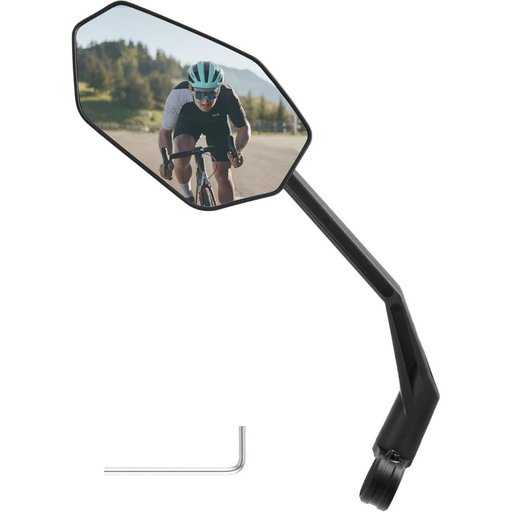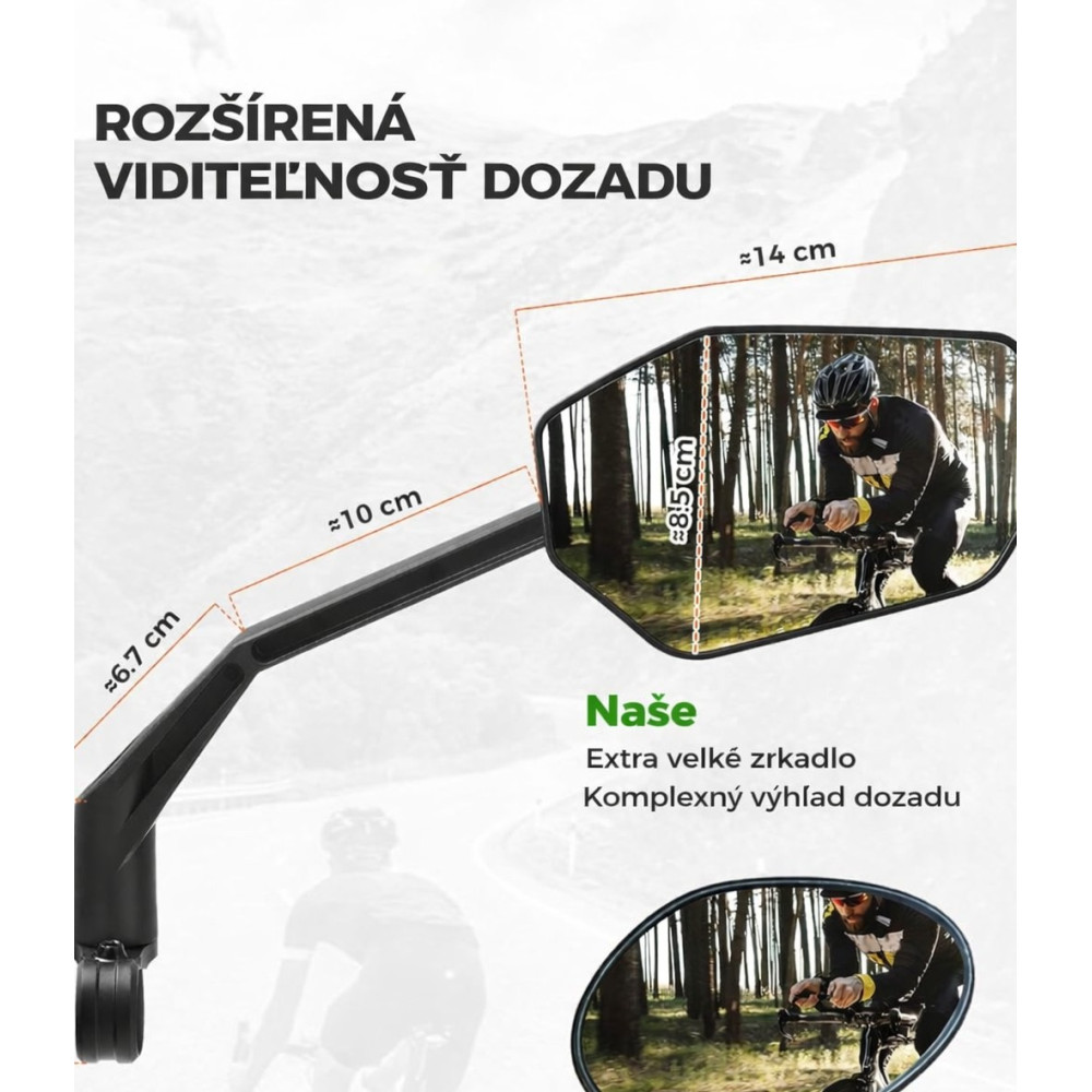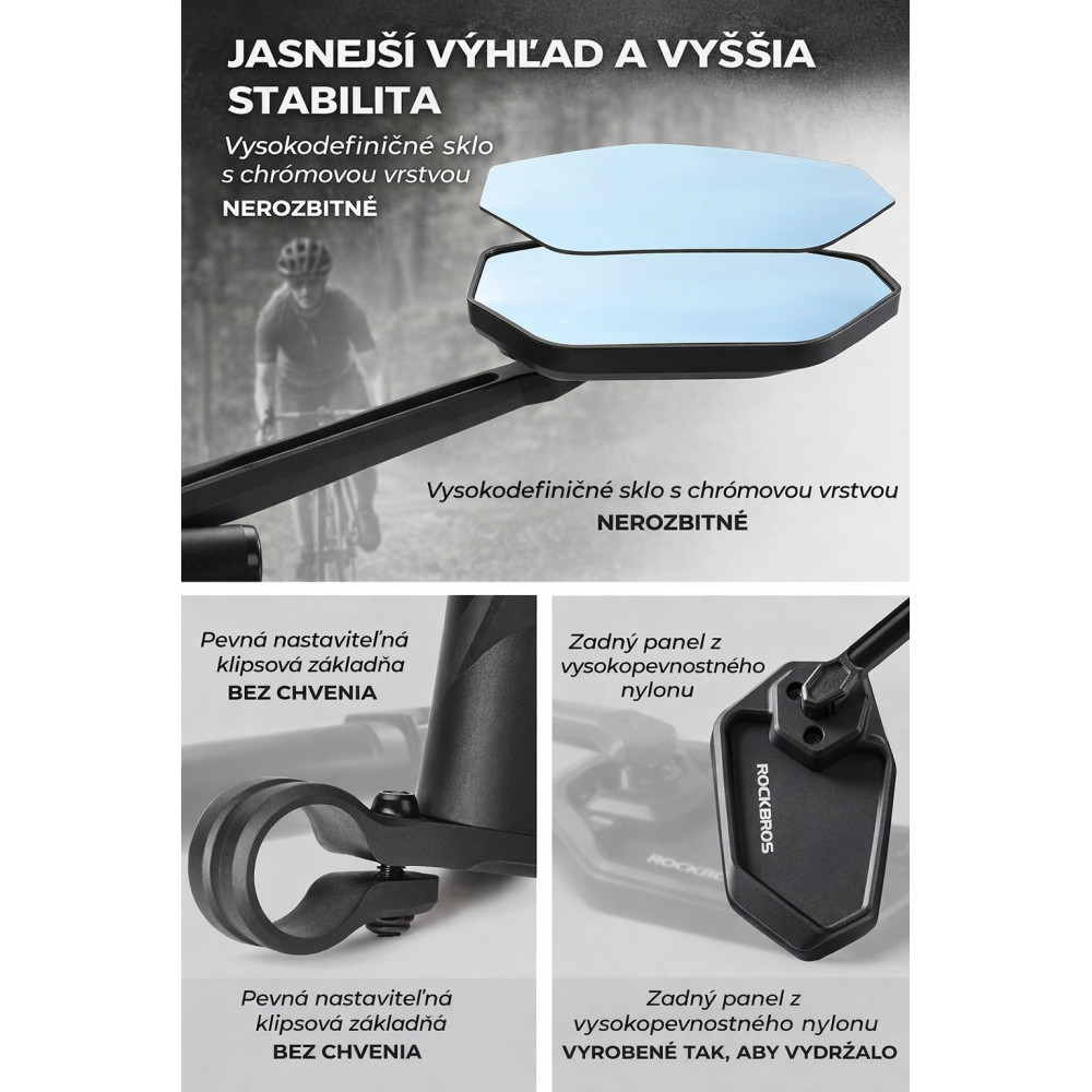 Značka RockBros, ľavé spätné zrkadlo. OSTRÝ HD OBRAZ. Modrá konvexná šošovka z odolného materiálu s antireflexnou vrstvou poskytuje rozšírené zorné pole a znižuje rušivé svetelné odlesky. Vďaka tomu máte vždy jasný prehľad o premávke za vami. PLNÝ VÝHĽAD. Zrkadlo je možné otáčať do všetkých smerov. Uhol pohľadu si tak prispôsobíte svojej polohe – či už sedíte vzpriamene v meste alebo ste predklonení počas jazdy na cestnom bicykli. Veľké zorné pole eliminuje mŕtve uhly a zvyšuje bezpečnosť pri zmene jazdného pruhu aj v zákrutách. ROBUSTNÉ A STABILNÉ NA VŠETKY CESTY. Vysokopevnostné chrómované sklo s nárazuvzdornou, nastaviteľnou základňou a klik upevnením. Drží pevne a bez vibrácií aj pri otrasoch, pre dlhodobo jasný výhľad. ŠIROKÁ KOMPATIBILITA. Vhodné pre všetky riadidlá (O 20–23 mm). Ideálne pre horské bicykle, cestné bicykle, mestské / trekingové bicykle, ako aj kolobežky a e-kolobežky. MIMORIADNE JEDNODUCHÁ MONTÁŽ. S priloženým imbusovým kľúčom nainštalujete v 3 krokoch: uvoľniť, nasadiť, utiahnuť. Okamžite pripravené na použitie.