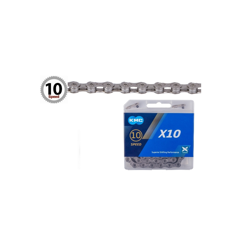 Značka KMC, reťaz 114 článkov, dľžka čapu 5,88mm. Reťaz KMC X-10 pre 10 kolo, vhodná pre MTB, cestné, trekkingové a cyklokrosové bicykle, skosené vonkajšie a vnútorné články pre rýchle a plynulé radenie, kompatibilná so Shimano / SRAM…, sivá, balená v krabičke KMC.