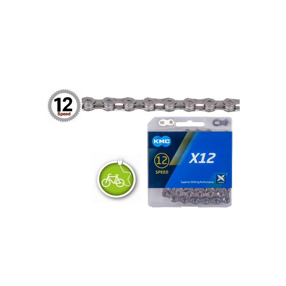 Značka KMC, reťaz 130 článkov. Extrémne odolná KMC E-BIKEová reťaz pre 12 kolo, vysoká odolnosť, so špeciálnou povrchovou úpravou ECO ProTeQ pre extrémnu odolnosť proti korózii, kompatibilná so Shimano / SRAM… , strieborná, balená v krabičke KMC.