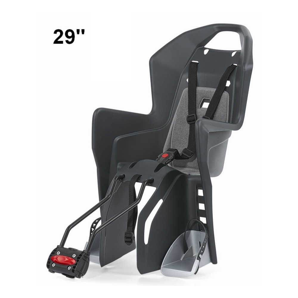 značka Polisport Portugalsko, zadná verzia, upevňovacia kovová konštrukcia na 29 bicykle s úchytom na sedlovú trubku,na priemer 28-40 mm, nastaviteľné opierky na nohy s bezpečnostnými popruhami, trojbodový bezp. pás pre zaistenie dieťaťa, odnímatelná výstelka, držiak na sedl.trubku pre rýchlu montáž/demontáž sedačky, max nosnost od 9 do 22 kg